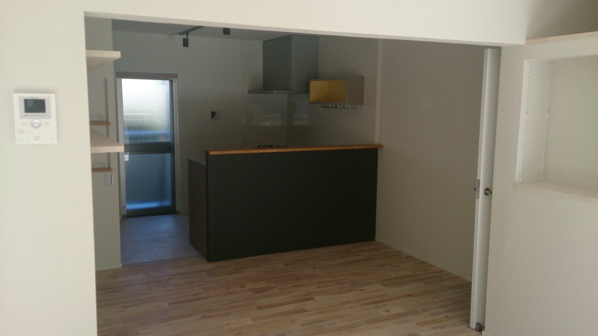 L型キッチン施工完了 壁面収納を取り付け、ワイングラスホルダー等も設置しました。...