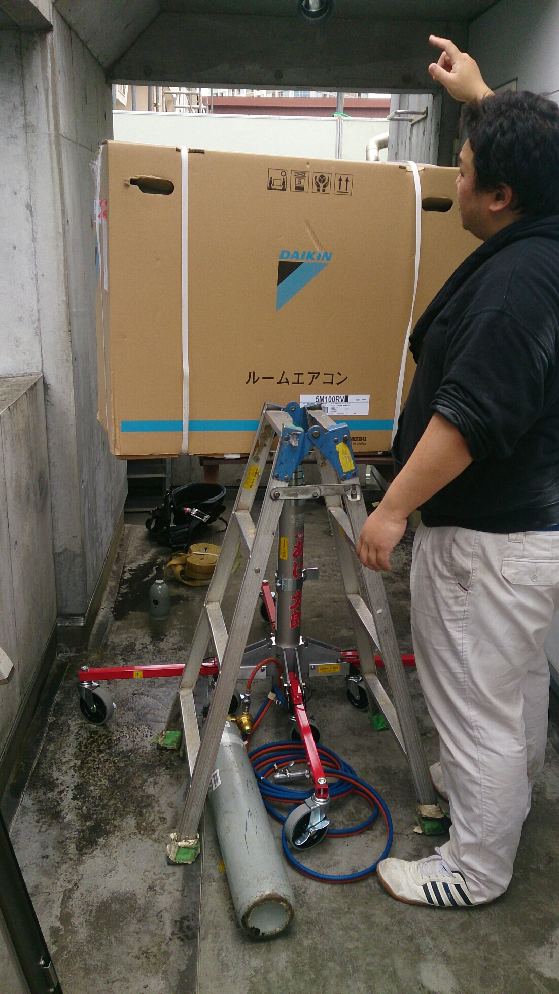 荷揚げをするための機械です。 エアコンの外機は、重いので、高所に設置する際に、酸素を利用してリフトupして、設置を補助します。 荷揚げの、機械も、結構重いんですけどね❗...