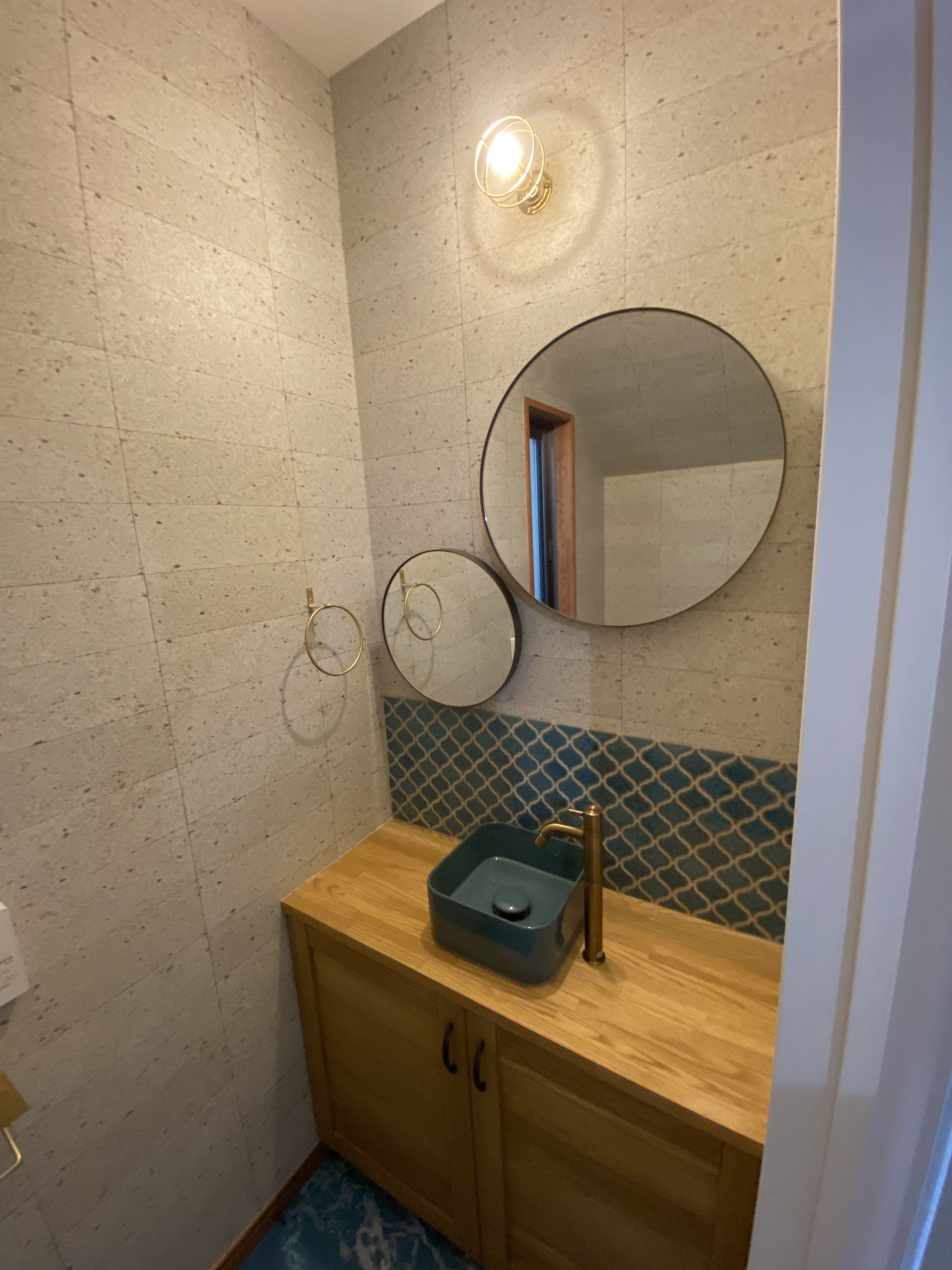 トイレ手洗い器廻りを造作し、店舗みたいなデザインに仕上げましたよっ!