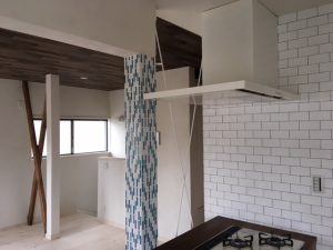 キッチン前の既存柱とレンジフード横のタイル施工です☆☆