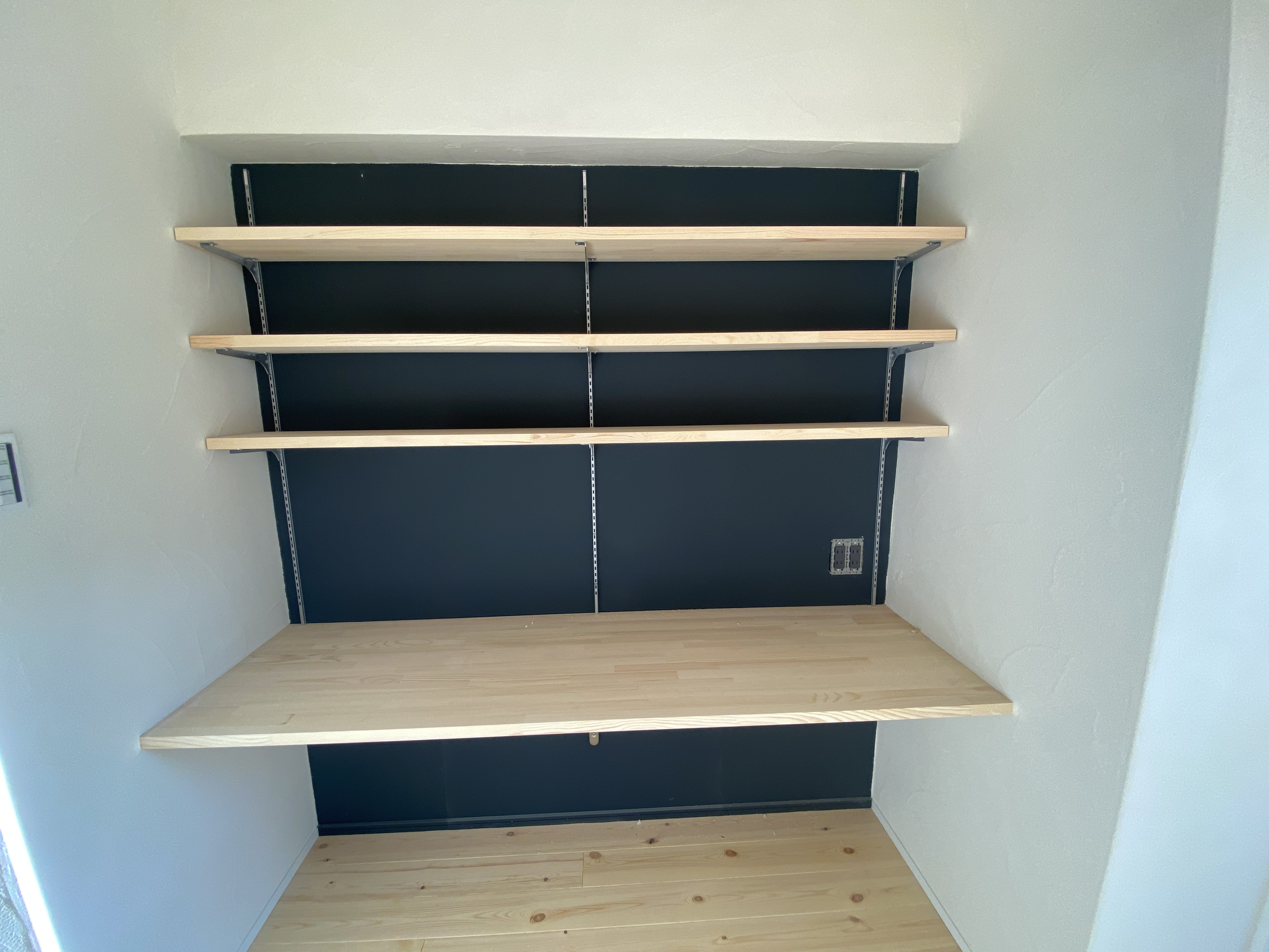 テレワークには欠かせない書斎デスク!上部には稼働棚もありますので書籍やファイル、電子機器も備えつける事も可能です☆☆壁はアクセントに塗装をしていますのでお洒落ですねっ!!