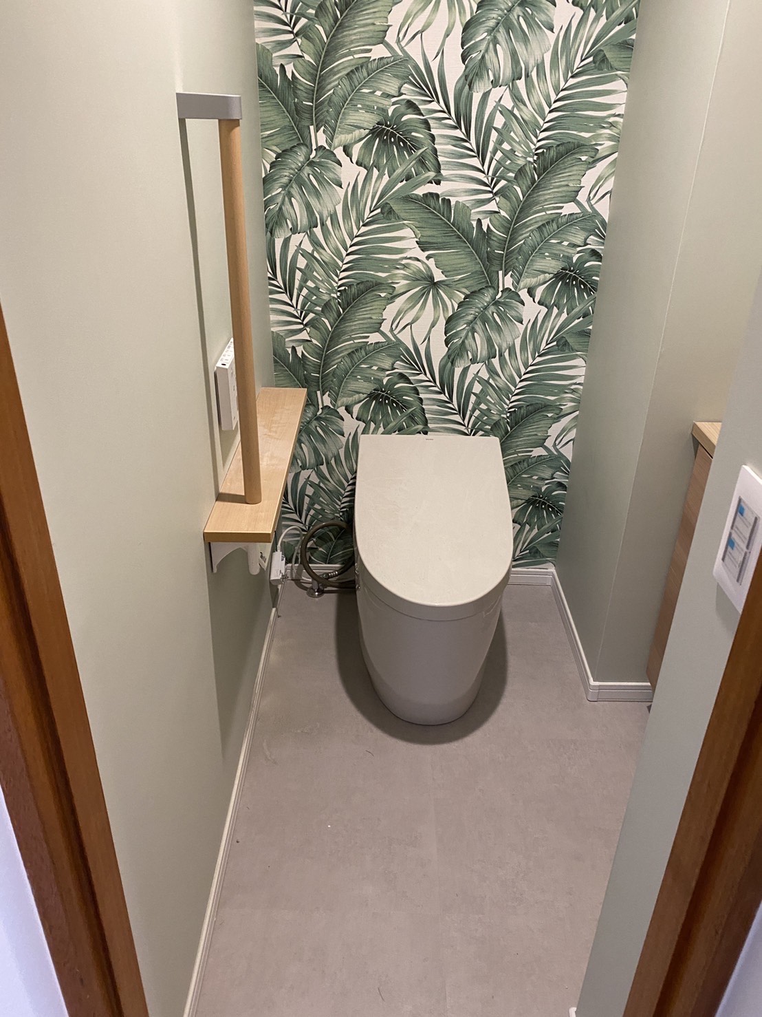 トイレの1面にアクセントクロスを張りましたよ☆☆