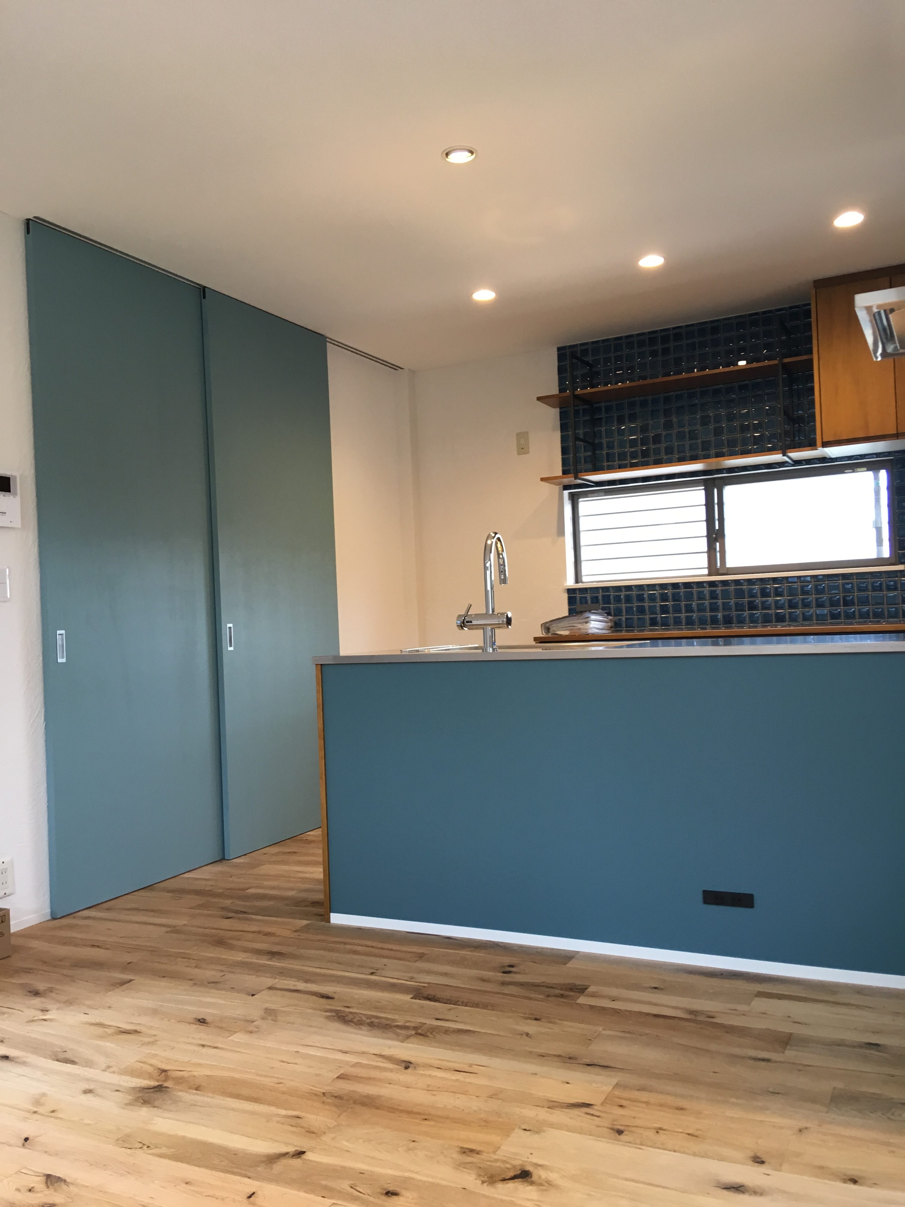 ウッドワン P型キッチンの前面パネルを外して塗装に変えるお施主様のこだわりもとても素敵です。前面塗装 カラーワークス Hip 8565D エッグシェル2分艶