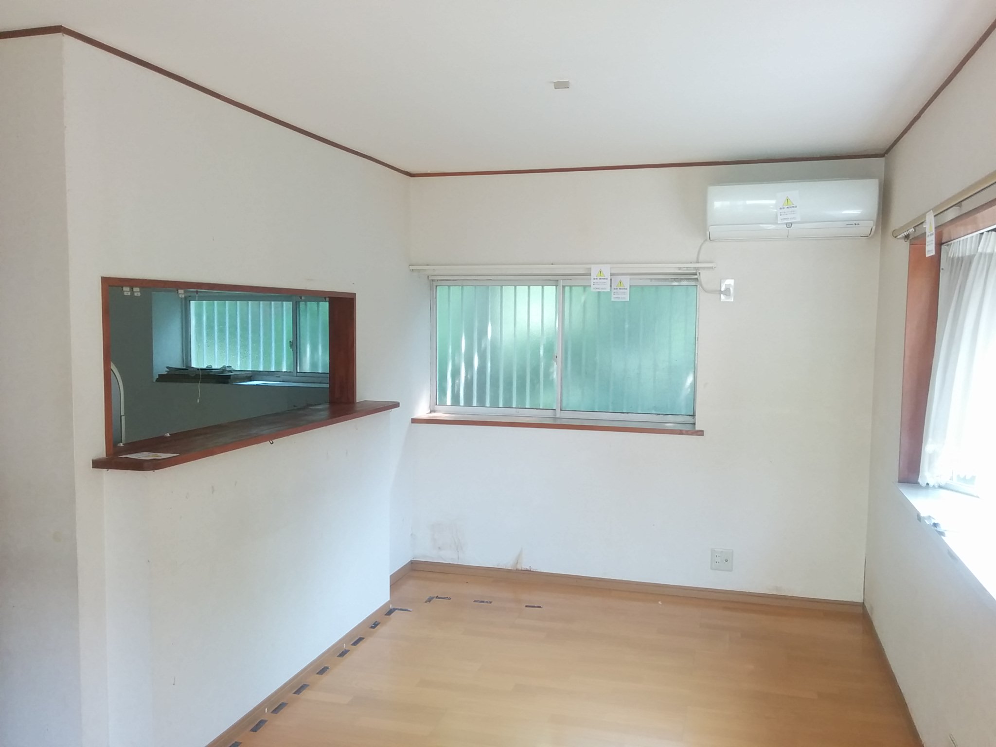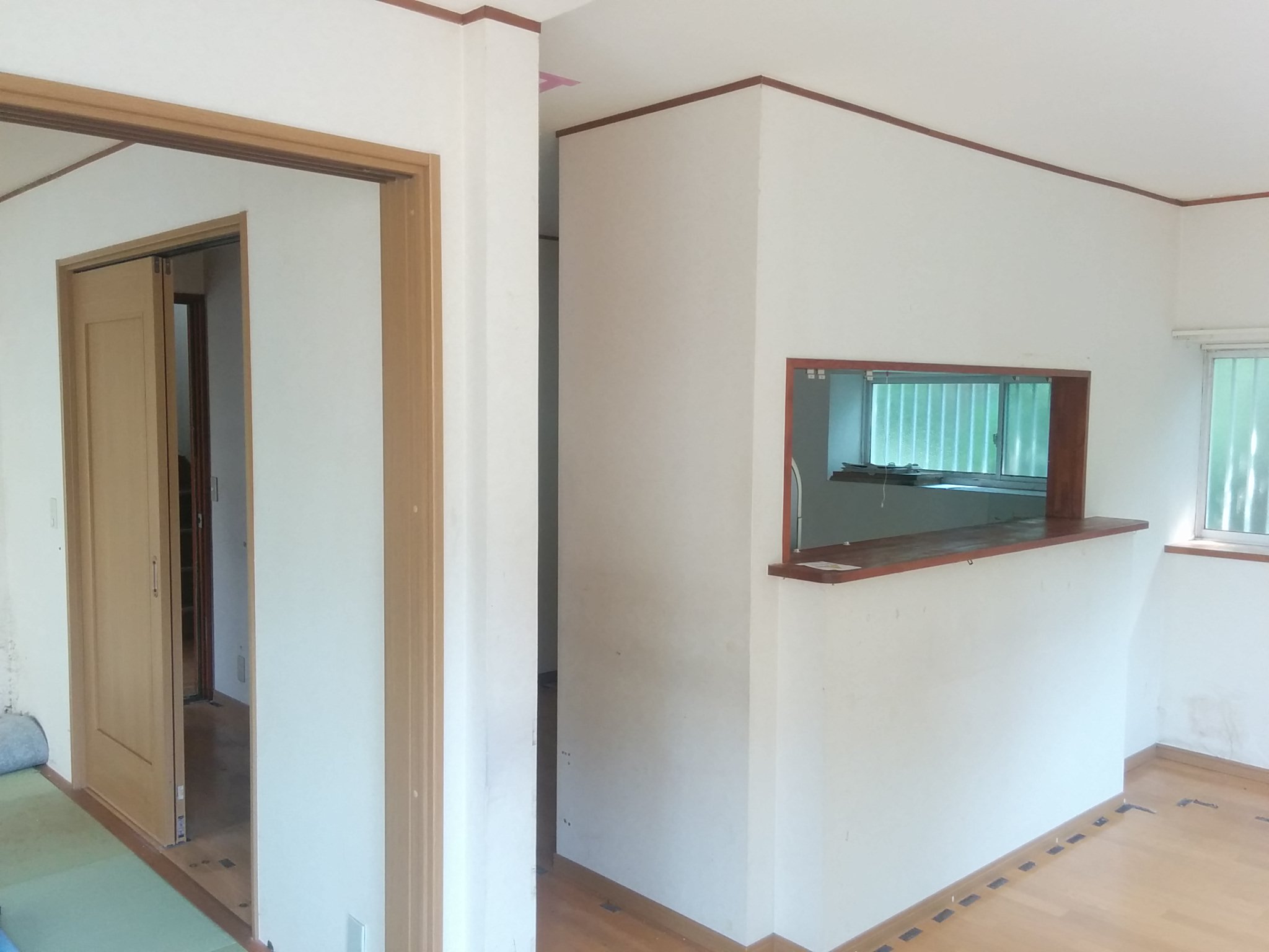↑改修前 既存の間仕切りの状態 和室~キッチン~ダイニング ↑改修後 雰囲気が大分変わりました。 床は無垢フローリング、壁、天井は漆喰で仕上げました。