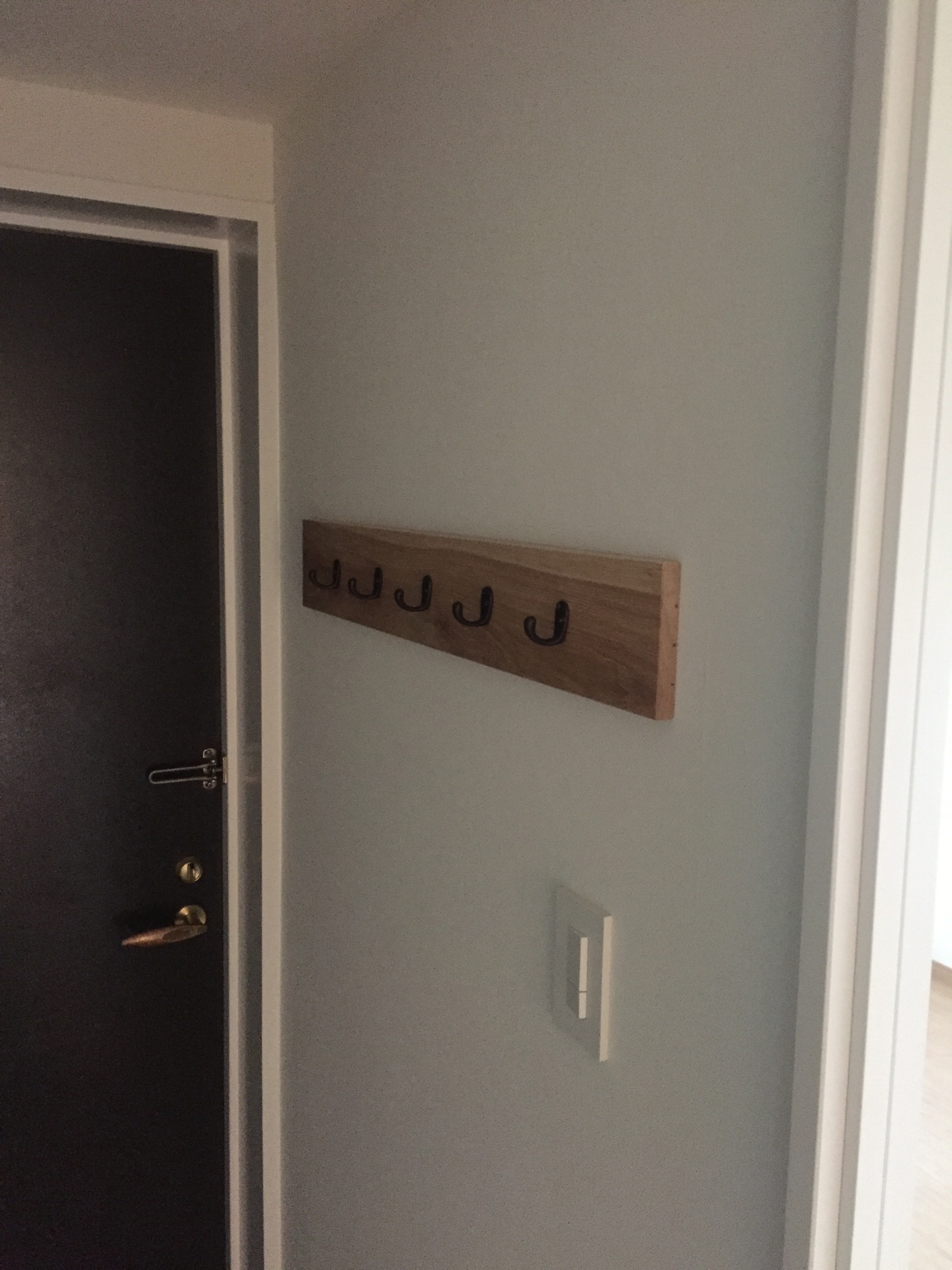 玄関物掛けフック 台座には床で使用したフローリングを使用しています。