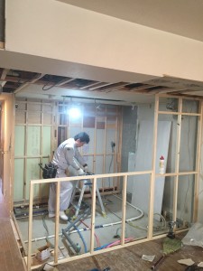 マンションリフォーム大工工事の様子です! 壁下地を組んで石膏ボードを貼っていきます。 ...