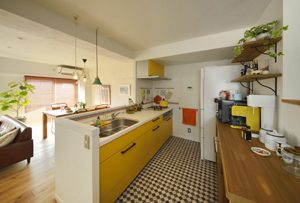 今回は水廻り <キッチン> モロッコタイル柄の床 壁にはターコイズブルーとキャロットオレンジという感じの色合いのタイルでボーダーを入れています。 キッチンはLIXILのソリットイエロー(からし色のような色合い) ...