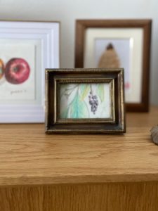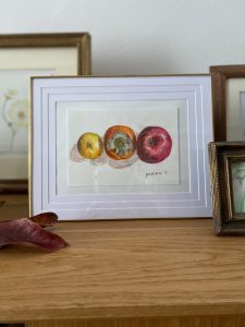今日の展示紹介はこちら 画材:ケント紙、鉛筆、水彩色鉛筆 やっぱり、食欲の秋かな~と思ってしまう、みずみずしいフルーツ。 見ているだけで口に入れた時の味が思い出させる作品です。 ご来店には...