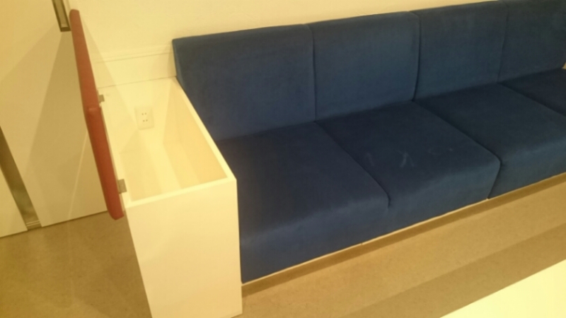 ひじ掛けを開けると…ドリンクやリモコンを納められる収納スペースを造作。