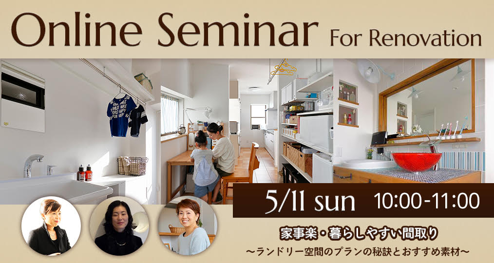 ◆まずはここから!リノベをお考えはじめた方向け◆ 5/11sun【オンラインセミナー】 家事楽・暮らしやすい間取り~ランドリー空間のプランの秘訣とおすすめ素材~ ◆開催日◆ 2025年5月11日(日) ◆時間◆ 10:00~...