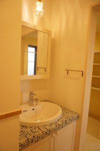 1Fも2Fも洗面化粧台はタイル天板がかわいいウッドワンの「無垢の木の洗面台」にしました♪