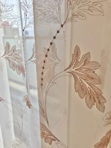 くすみピンクの刺繍が入ったシアーレースのカーテンを1枚かけることにしました。