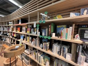 1Fの展示で使われていたクランプで組み立てた本のリサイクルBOXがあったり…