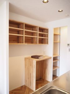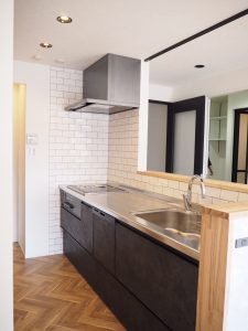 キッチン前には洗面所を設け、家事動線もなるべくスムーズにしています。