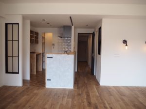 キッチンの扉をヴィンテージ感のある風合いを選び、LDKのアクセントにはブラックを取り入れております。