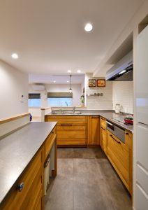 無垢の木とステンレスバイブレーションの天板は相性抜群です*