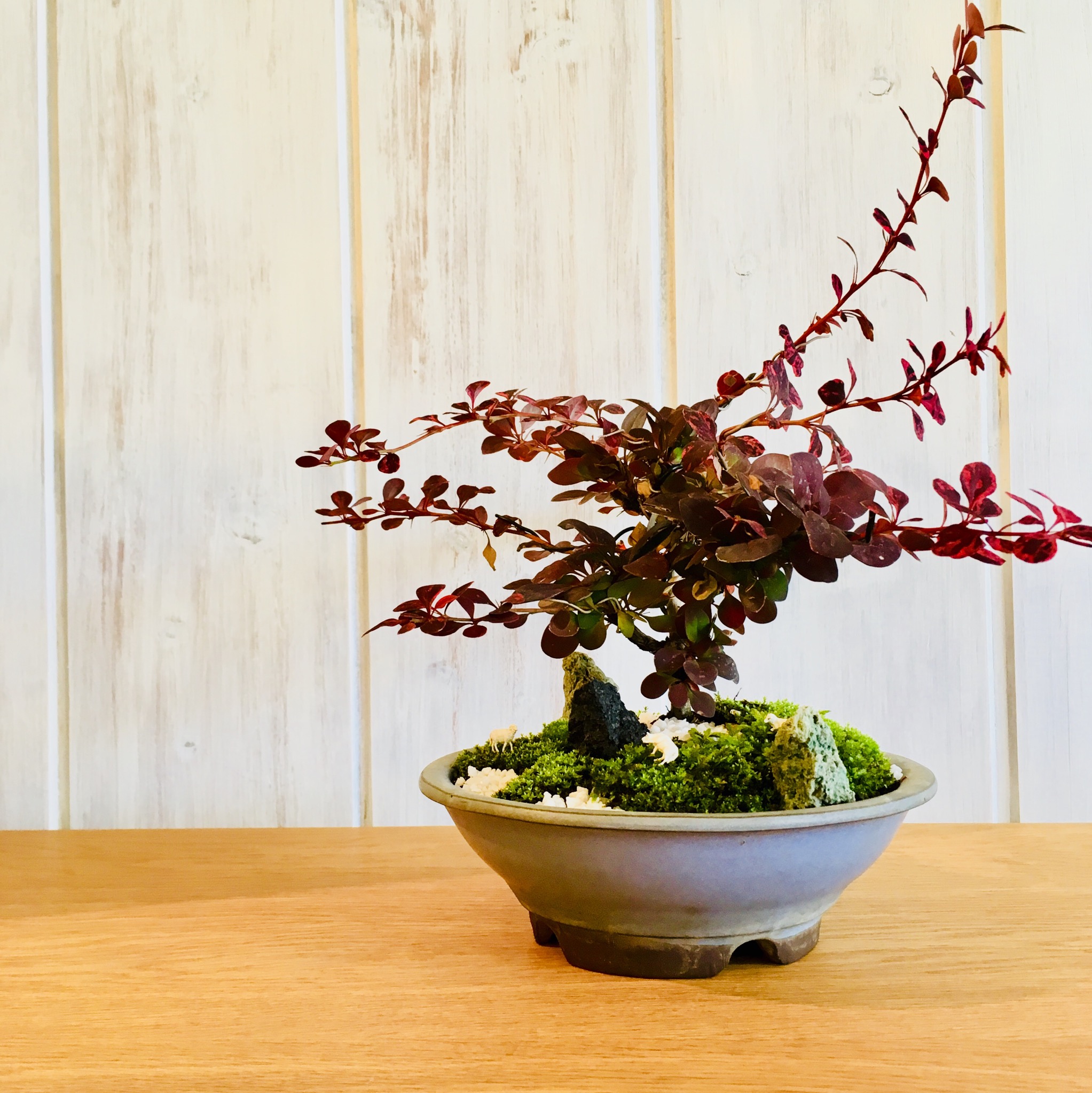 新緑、紅葉と四季を楽しめるメギ(目木)。針金でカタチをくせづけ、世界に一つだけの箱庭をつくります。