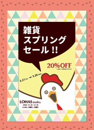 春の雑貨セールのお知らせです。 LOHASstudio全店で、 3/17(金)~3/26(日)雑貨20%OFFセール を開催致します! ※一部除外品有り ❁営業時間10:00~18:00❁ ※3/21・22(火...