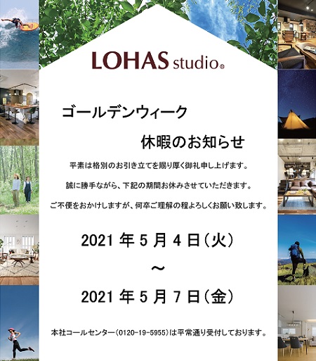 LOHAS studioでは、下記の期間をゴールデンウィーク休暇とさせていただきます。