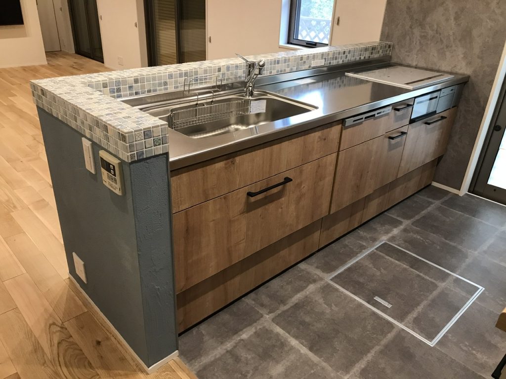 リビングダイニングキッチンは広々とした空間で、床は無垢材、壁は珪藻土、キッチンの天板にはタイルと、自然素材に囲まれた素敵なお部屋になりました
