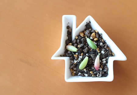 お手入れしている間にぽろっと落ちてしまった葉は、 土の上にころんと置いておくと、根やちぃさな芽が生えてくる・・はず。 琺瑯のカップやお家のカタチのプレートに土を入れて、そこに並べてみます。 発芽を楽しみに見...