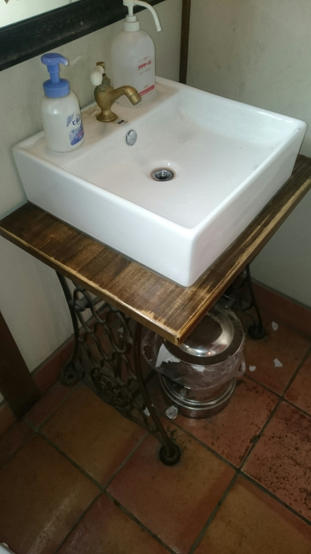 昔ながらのミシン台に洗面器を乗せて個性的な手洗いに!