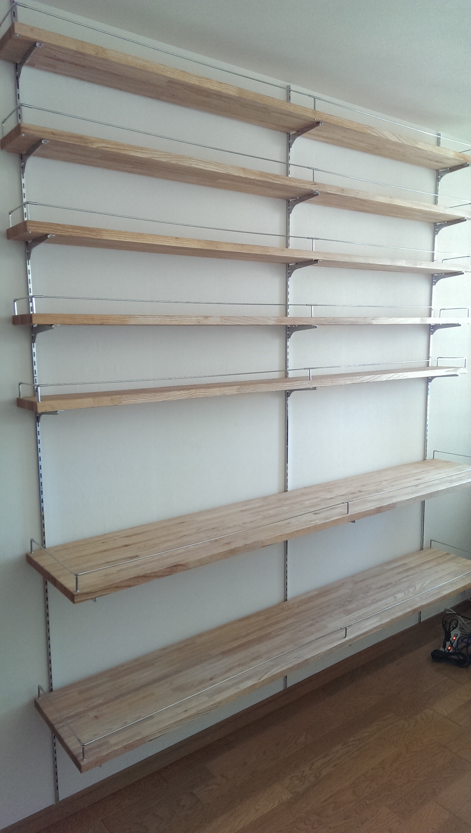 アッシュ材のクリア塗装。完全オーダーなのですが、下地が無いので、一度壁を剥がしてベニヤ板を貼り、壁をクロスで復旧してします。