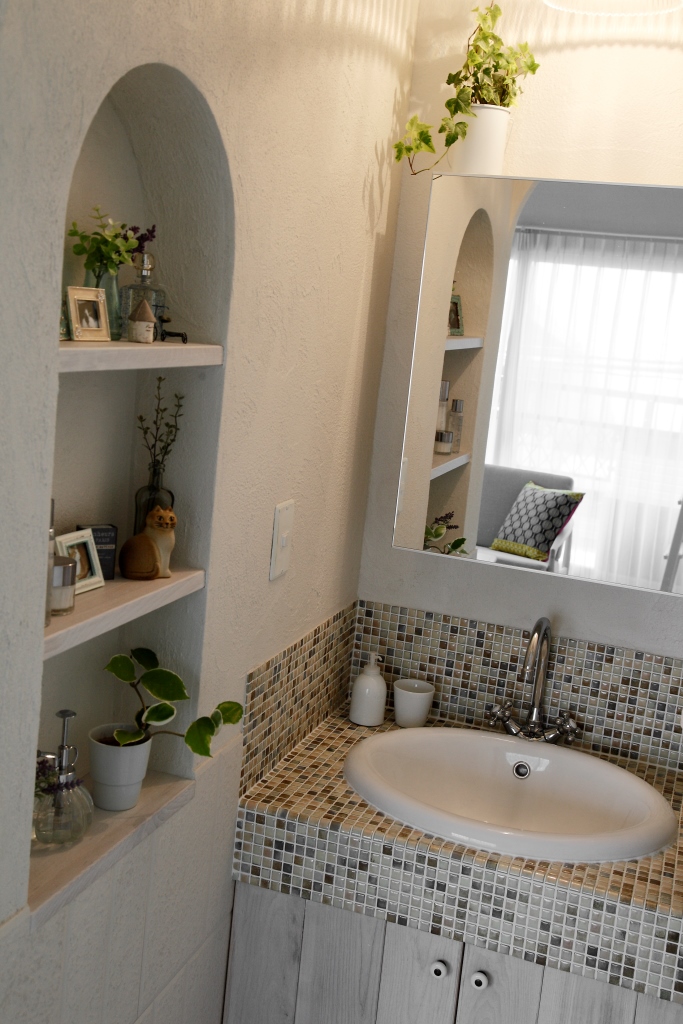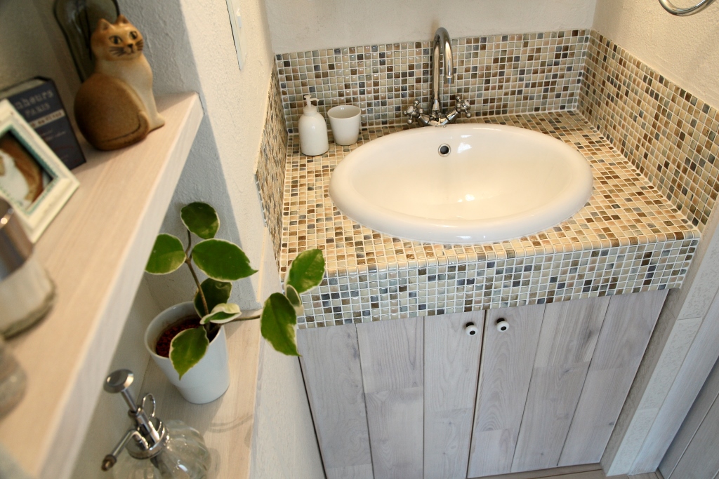ボウルも水栓もミラーもタオル掛けもすべて組み合わせを考えてチョイス。