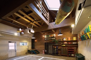 大人から子どもまで楽しめるテーマパークのように、遊び心いっぱい散りばめたガレージ。ガレージ2階の収納庫は小さな扉から二階の寝室へと繋がっていたり、玄関の鏡扉を開ければガレージへつながっていたりと、まるで秘密基地のようです。先祖代々の写真が並ぶギャラリースペースやライブラリーコーナーも、訪れた人に喜んでいただきたいという想いから。