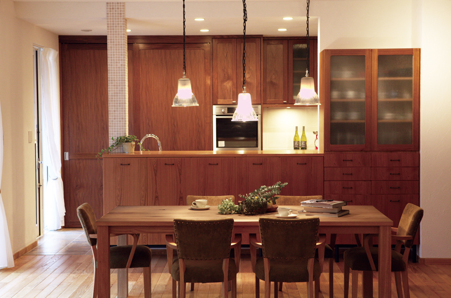明るい光で満たされた「アメリカ西海岸」をイメージしたリビング・ダイニング。 EM珪藻土の壁に自然無垢材のオーク材など、自然素材をふんだんに採用。 フランスのローカル駅にあったというアンティークの時計が印象的。