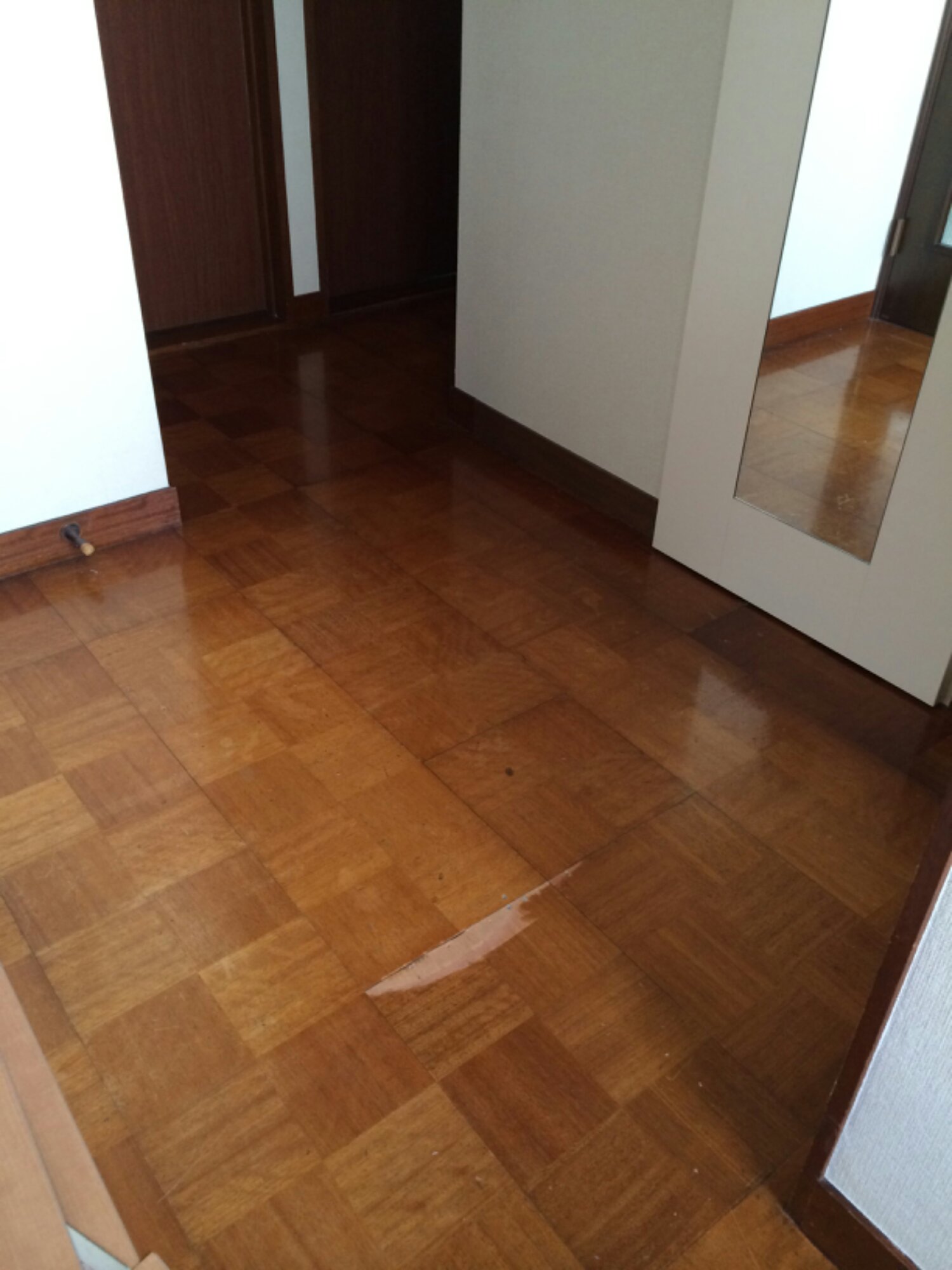 こちらが施工前の状態。 こちらが施工後。 既存の床を解体することなく上から貼るリフォーム材を施工しました。 厚さ1,5㎜の材料を既存の床に貼る施工方法です。 玄関框の材料もあります。 今回はアクセントとして、巾木は...