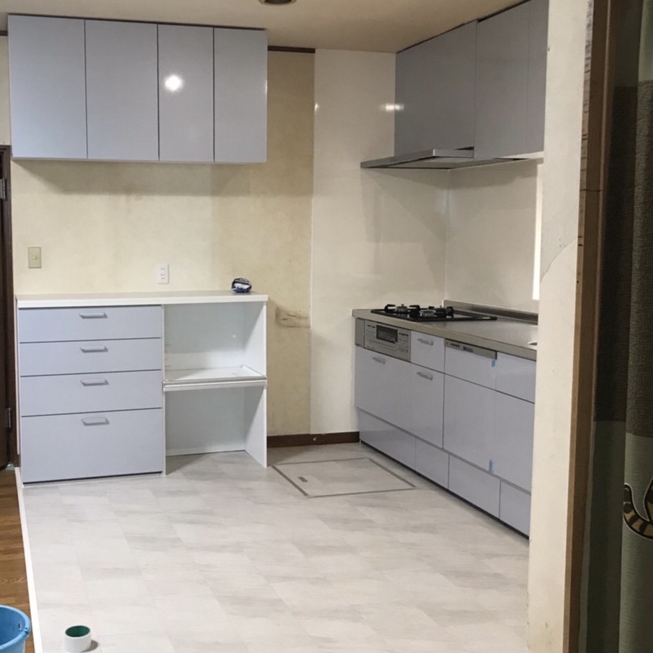 キッチン幅をI型に変更し、既存と逆L型になる様、新たにカップボードを設置しました。