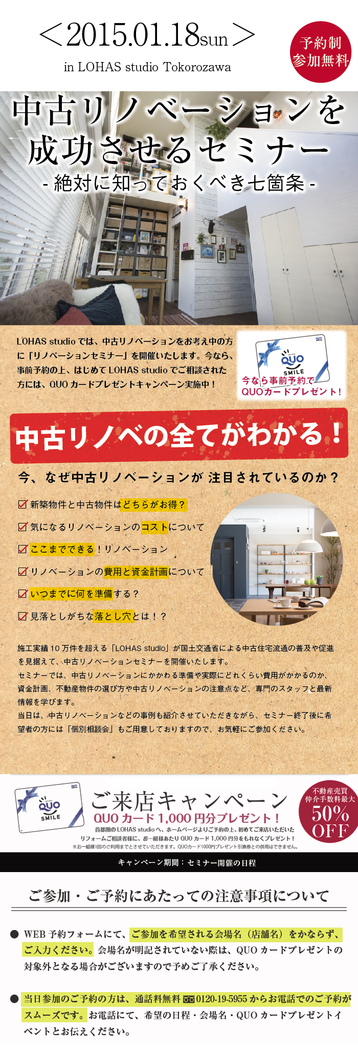 LOHAS studio 練馬店にて、1/24(土)-1/25(日)の2日間、[予約制]リフォーム&リノベーション無料個別相談会を開催致します。中古を買って賢く!お得に♪ ちょっと見積りを頼む前にお気軽に相談会へ! ドラマで見るような家づくり・・・。私たちと一緒に、リフォームのお話をしませんか?