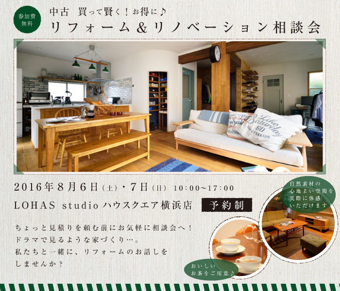LOHAS studio 練馬店にて、1/24(土)-1/25(日)の2日間、[予約制]リフォーム&リノベーション無料個別相談会を開催致します。中古を買って賢く!お得に♪ ちょっと見積りを頼む前にお気軽に相談会へ! ドラマで見るような家づくり・・・。私たちと一緒に、リフォームのお話をしませんか?