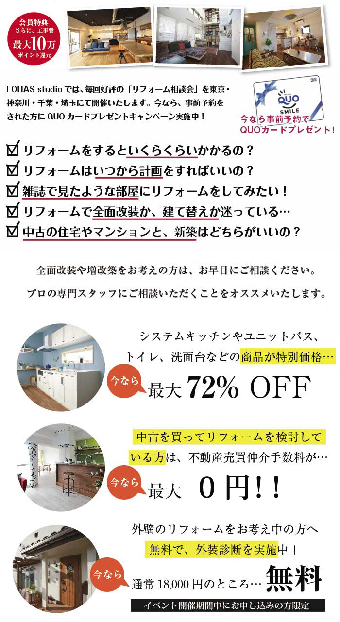 LOHAS studio 練馬店にて、1/24(土)-1/25(日)の2日間、[予約制]リフォーム&リノベーション無料個別相談会を開催致します。中古を買って賢く!お得に♪ ちょっと見積りを頼む前にお気軽に相談会へ! ドラマで見るような家づくり・・・。私たちと一緒に、リフォームのお話をしませんか?