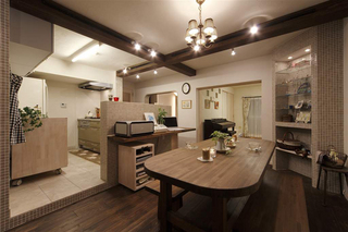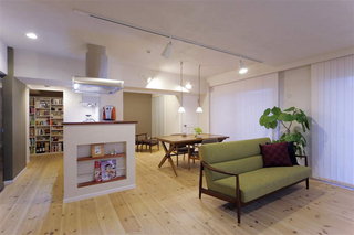 中古マンションを購入。リフォーム済み物件の不自然なキレイ感を取り、古い戸建ての雰囲気を出したいというご要望でした。古びた床材のイメージを無垢フローリング、パインをダークカラーに塗装することで出し、建具やキッチンカウンターもカラーを統一した。キッチンのカウンターは、6角形のモザイクタイルで、亀甲紋を作…
