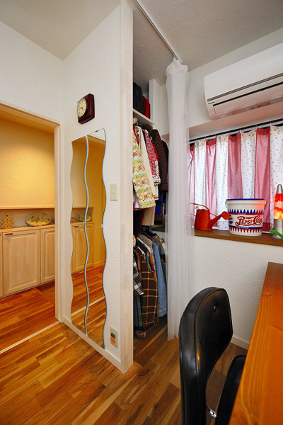 寝室扉の横に造作した衣服収納は、廊下側の玄関収納との段差を活かして作られています。