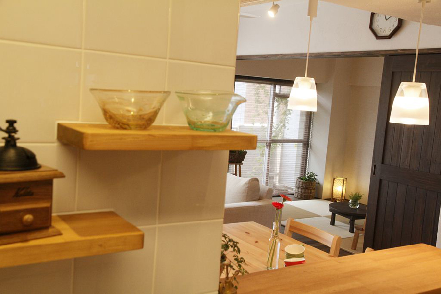 将来的にマンション自体の配管交換が予定される為、パイプスペースは解体を考えての間取りと施工に。雨の日は和室に洗濯物を干して、お客様がきたら壁と一体の建具を閉めて目隠し。リフォーム後は、ご両親も良くなったと喜んでくれているそうです。