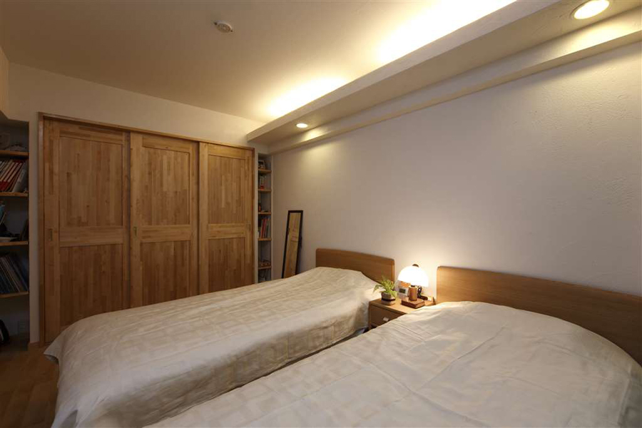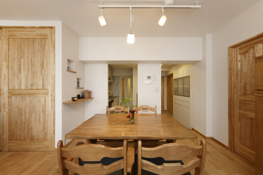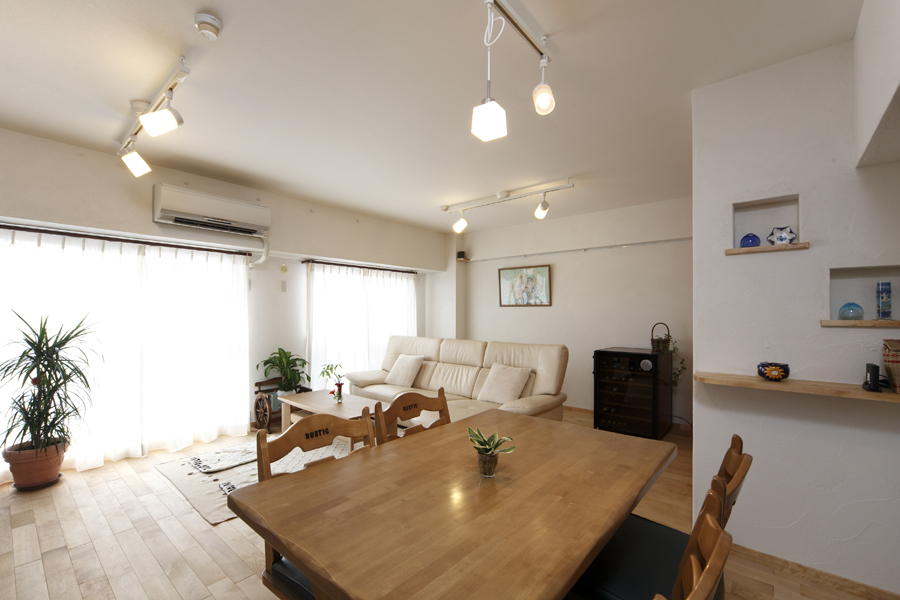 友人を招きホームパーティができるLDにし、収納を増やして部屋に物が出ていないようにしたい。また、2室の洋室をもっと有効に使用したいという3つの大きな希望がありリフォームされました。大型TVと大きなソファ・ワインセラーをLDに置きたい希望があり、和室を洋室としLDを拡大。キッチンも半クローズだった間取りをオープンとし、アイランドカウンターを新設し回遊タイプに変更。廊下スペースもLDKに取り込み、カラーをナチュラル色でまとめ、広々LDKへ。広がりを出しました。