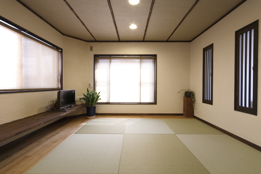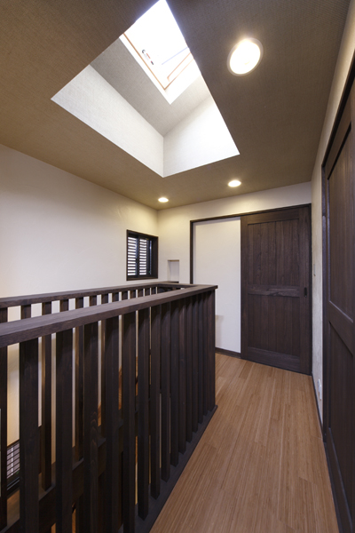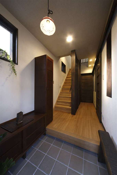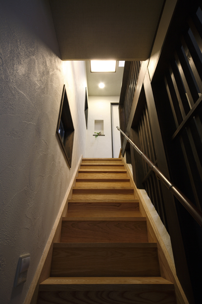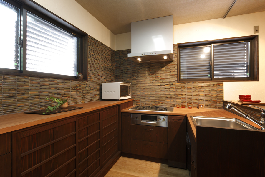 お仕事の定年を機に、家にかけられる時間が出来たことと、家に居る時間を大切にしたいという想いが重なり、居心地良く落ち着いた雰囲気を持ち、人が集まれる空間にしたい、というご希望でフルリフォームをされることになりました。和のデザインを取り入れ、水平・垂直ラインを強調し、家全体に高さと奥行き感を出しました。3室に仕切られていた1階は玄関を移設し、長手方向に階段、廊下を繋げたことにより、LDKの縦長の空間に。少人数・大人数にもフレキシブルに対応できる間取りです。全体にカラーはダーク調で統一し、しっとりとした落ち着きを出しました。外観はモダンな町屋をイメージし、和のデザインを大事にしました。