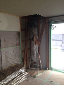 耐震工事に伴い、既存の石膏ボートを剥がし