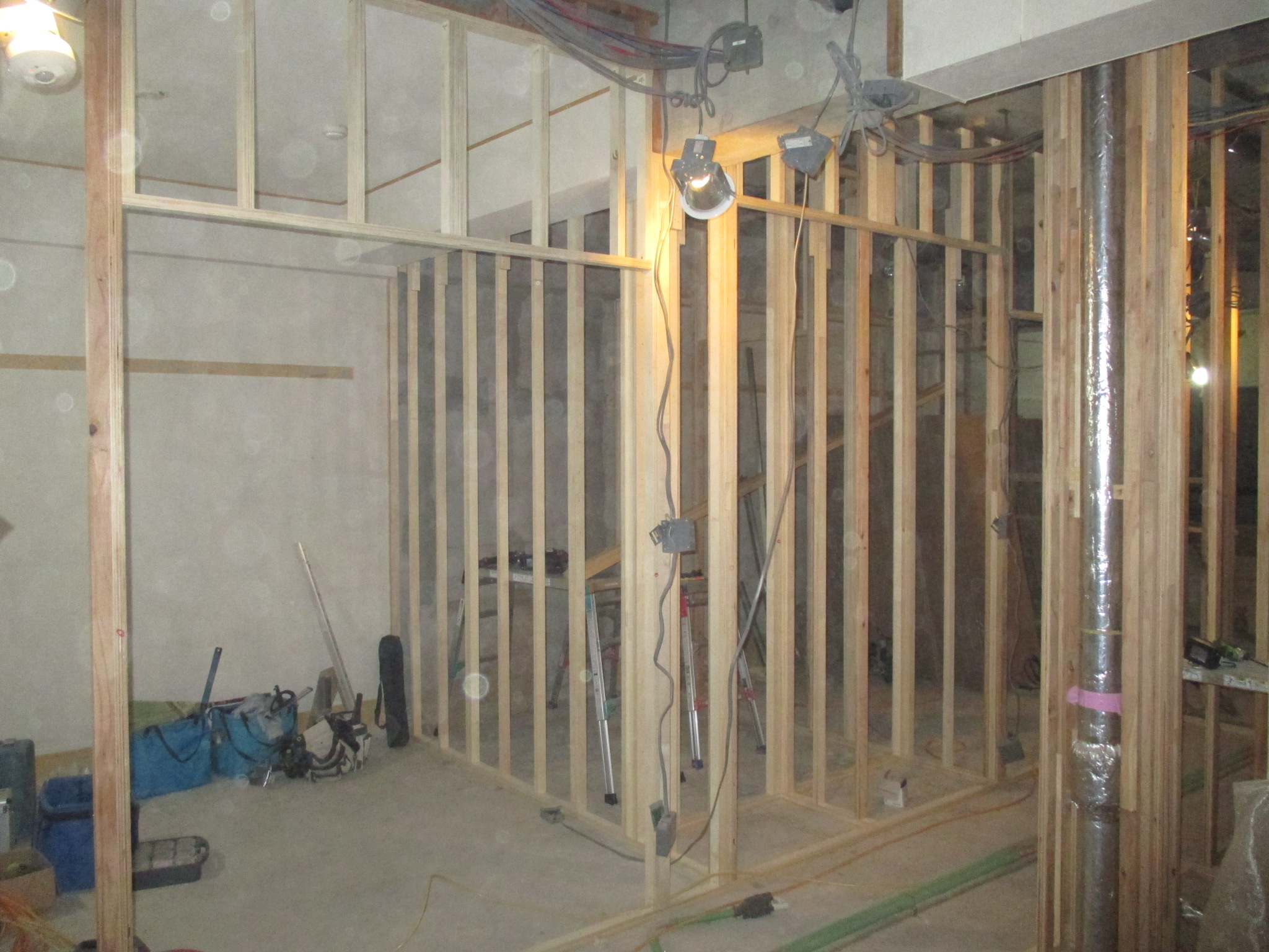 着工4日目 ほとんどの壁の軸縦が終わりました。 壁のラインが出来たので今度は床の下地工事を行います。