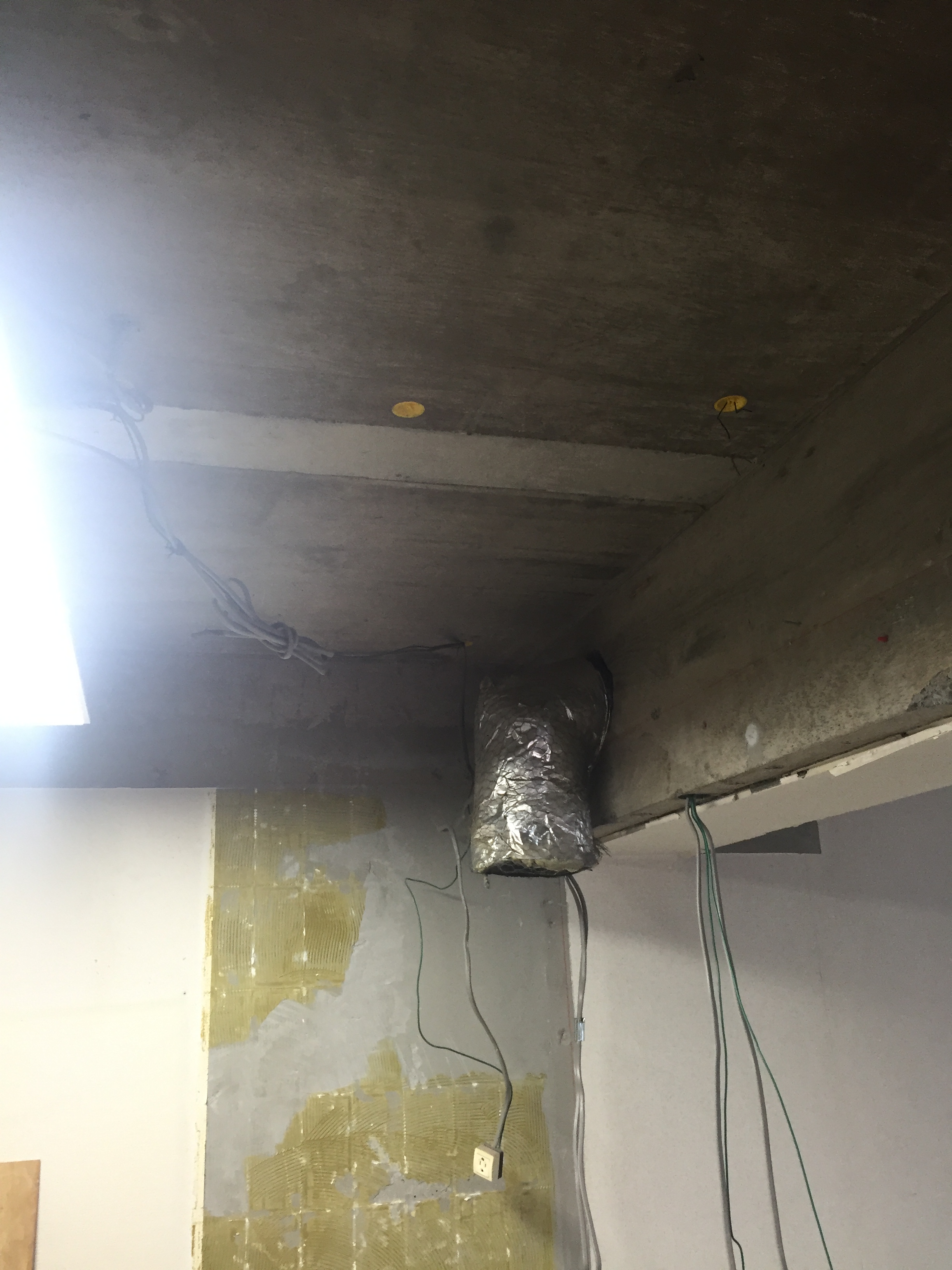 キッチンのレンジフードが、構造躯体の梁を貫通して施工されています。