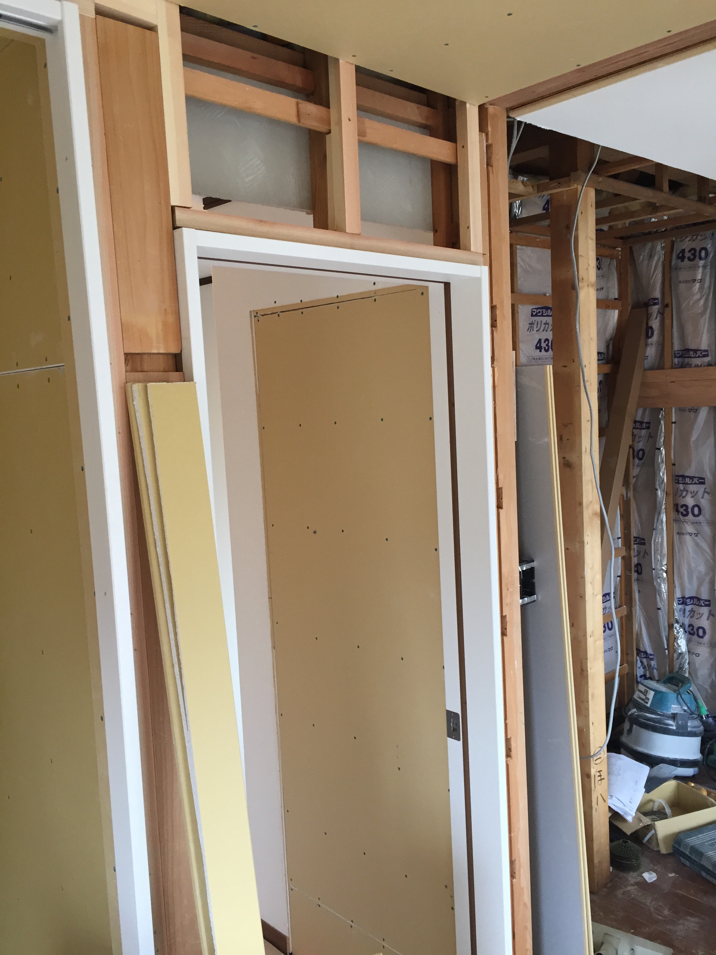 建具の取付途中になります 柱に建具の枠を固定しているところです。