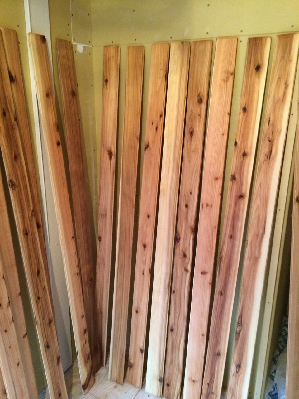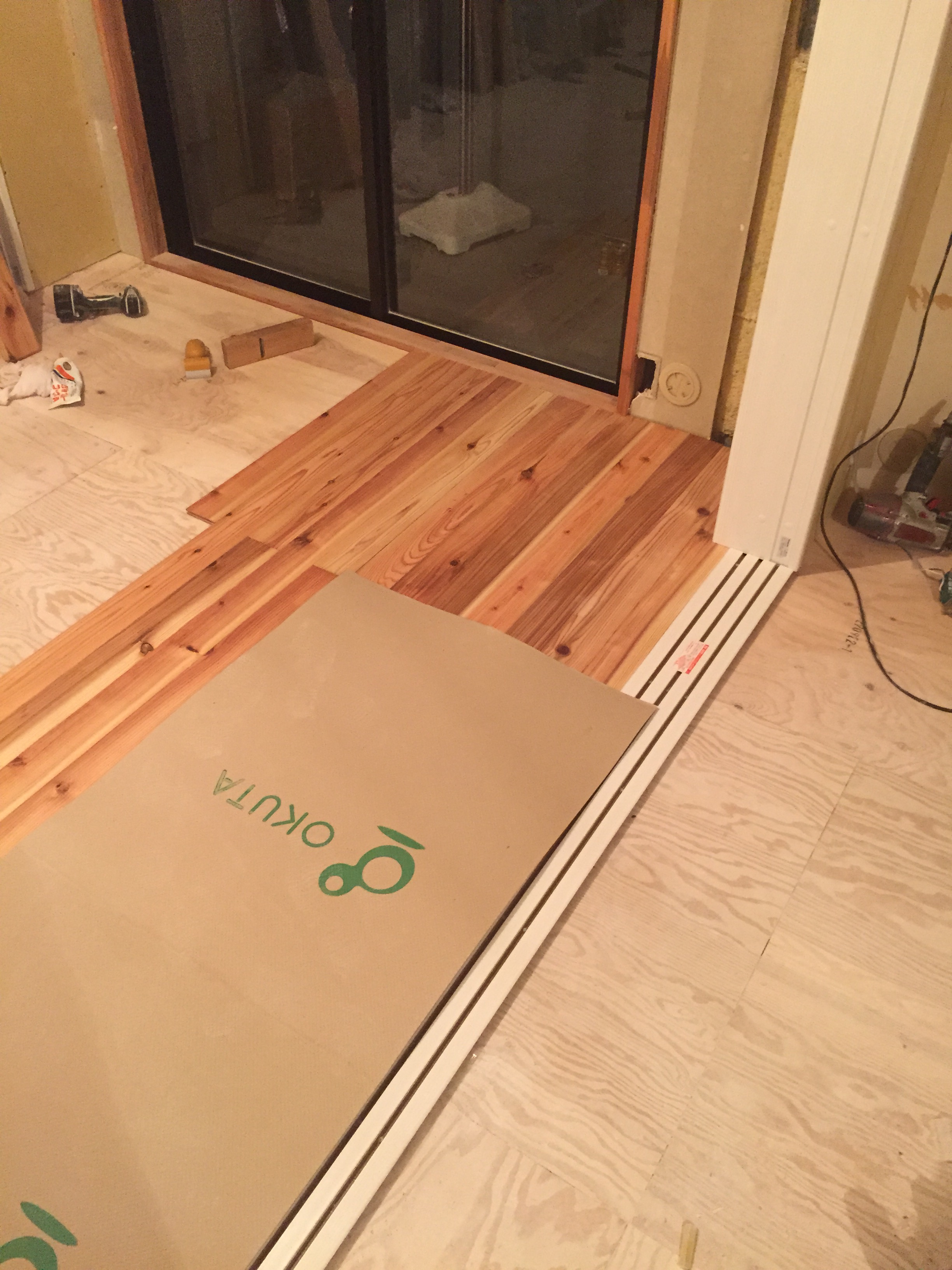 杉のフローリングを施工しています。 杉は、パインと同じくらいの木の柔らかさで日本人になじみの深い材木です。 節が気になる方には、苦手な樹種かもしれません
