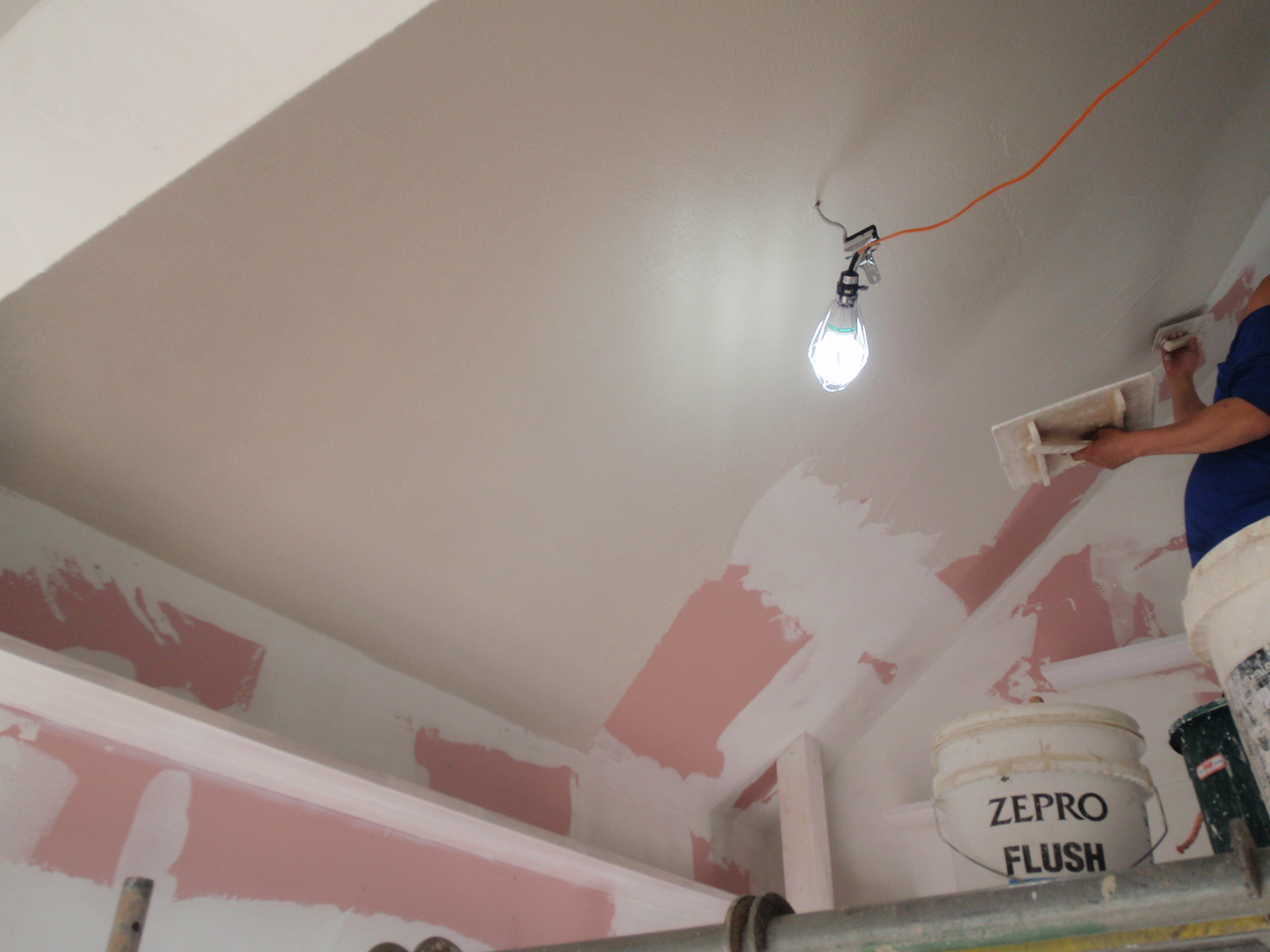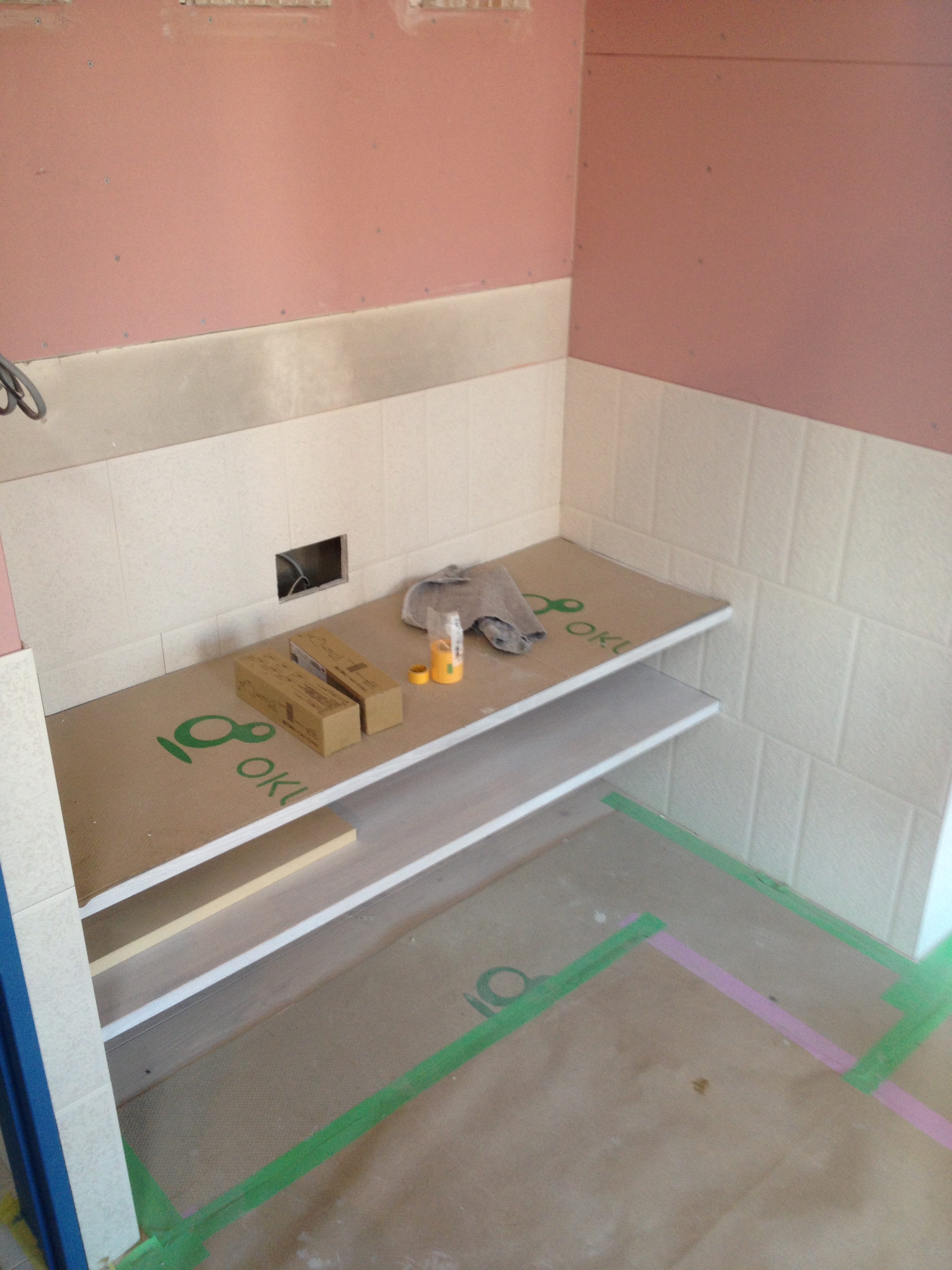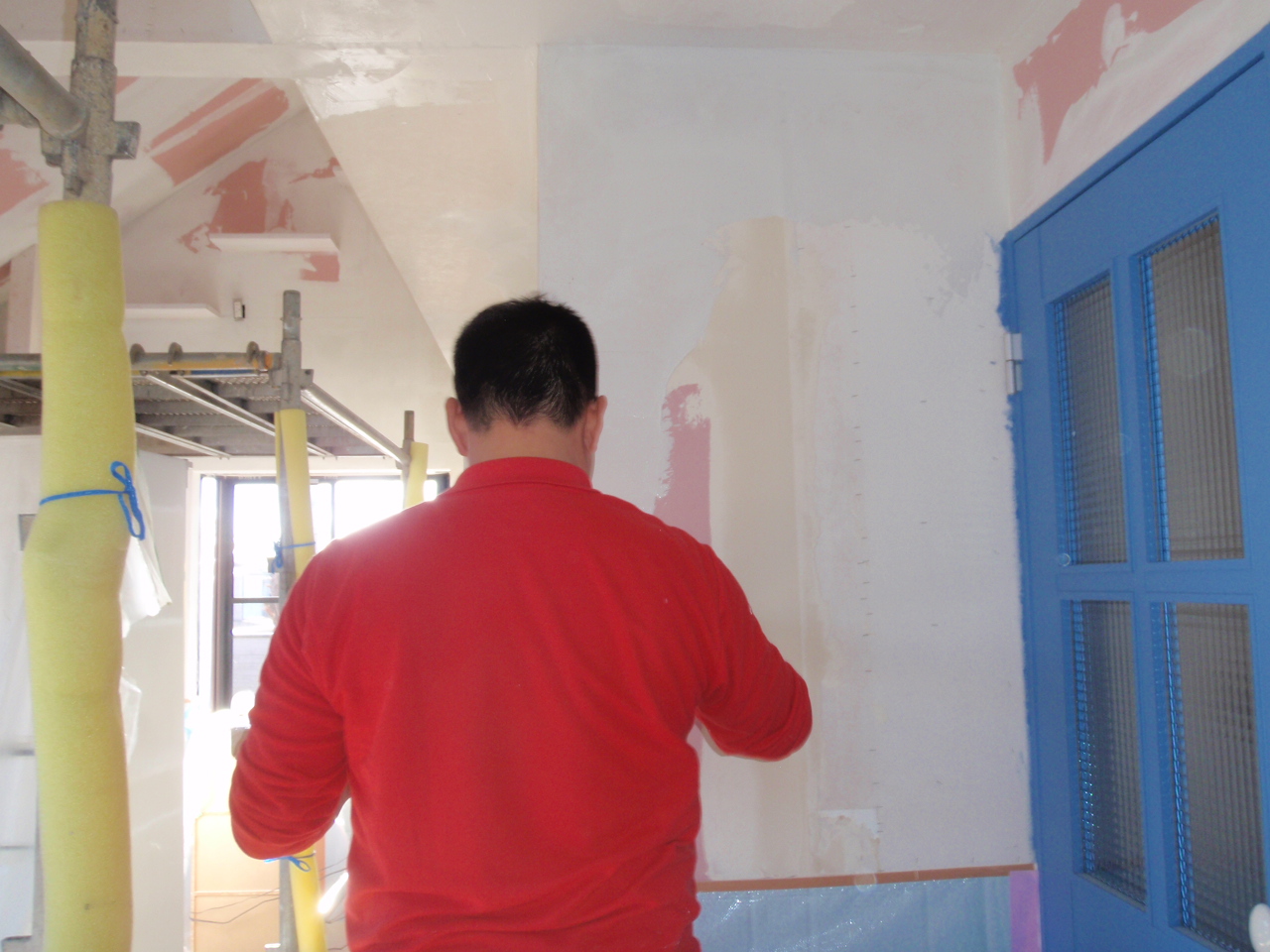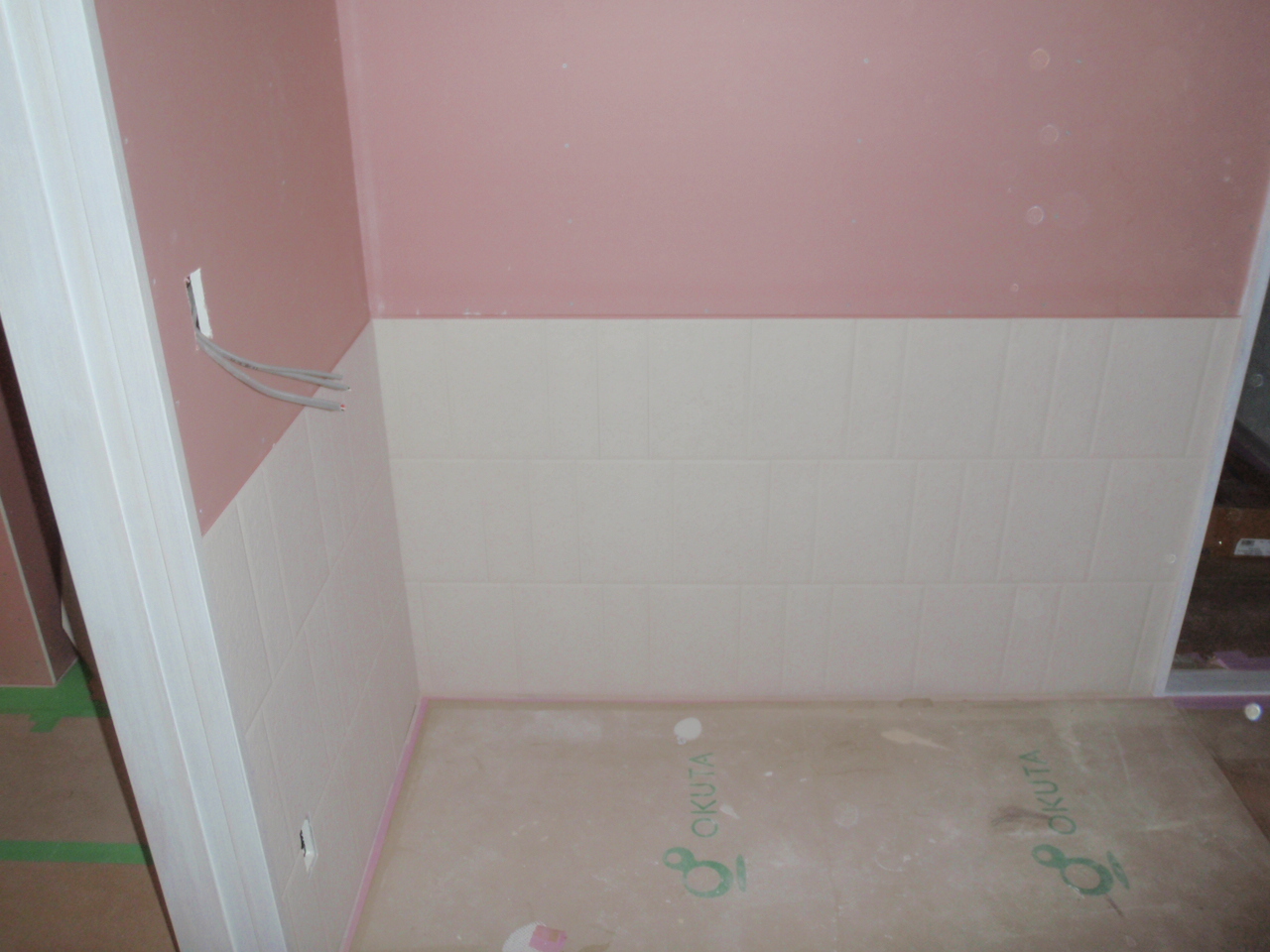LDKの改装工事が進み、リビングの腰壁にエコカラットをはり始めました。 パターン貼りで貼っていますので、仕上がりもかっこいいです。 エコカラットの上は、珪藻土を仕上げます