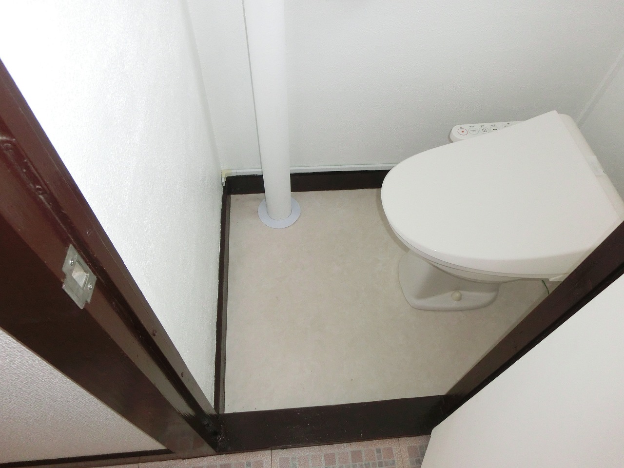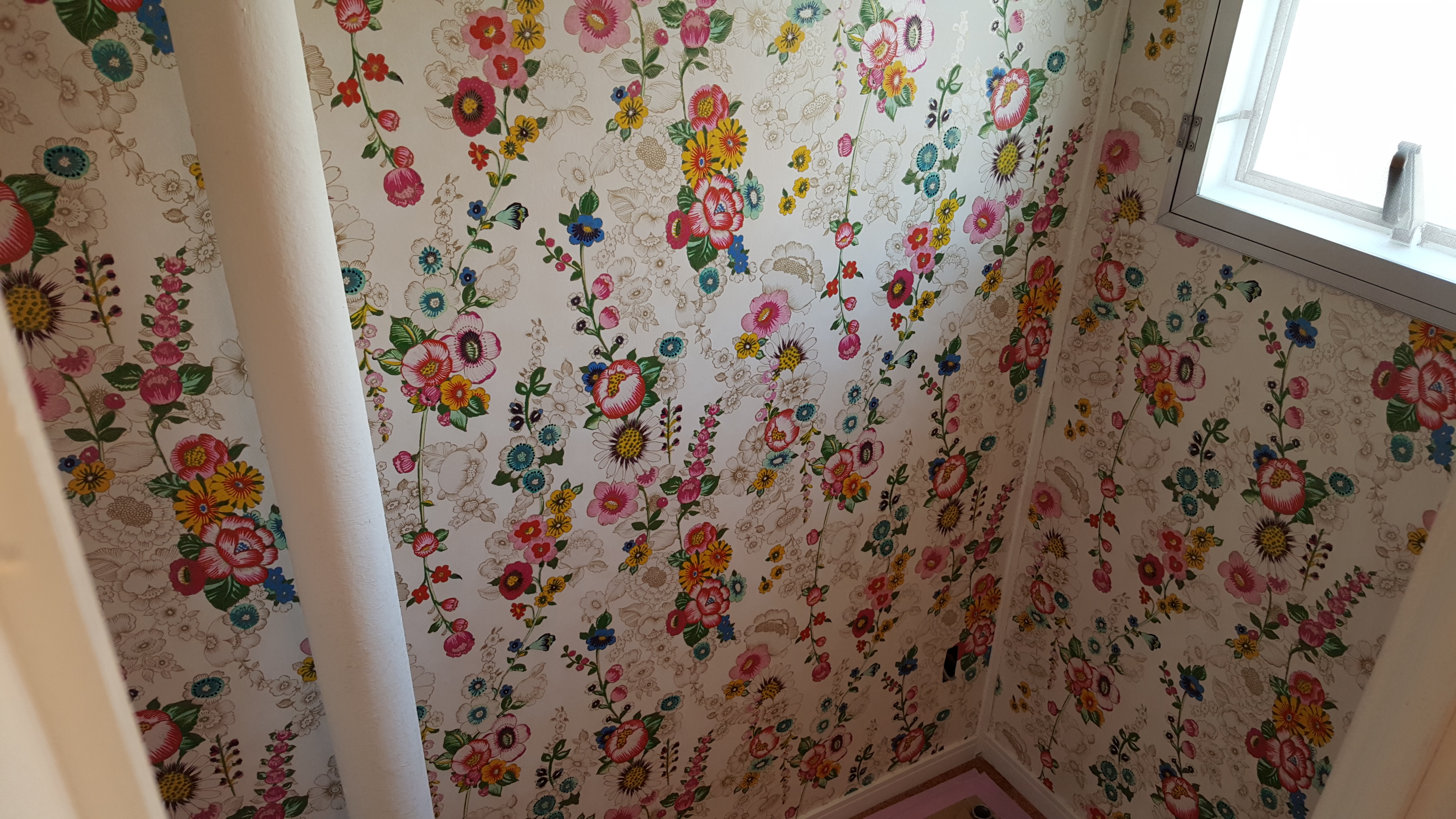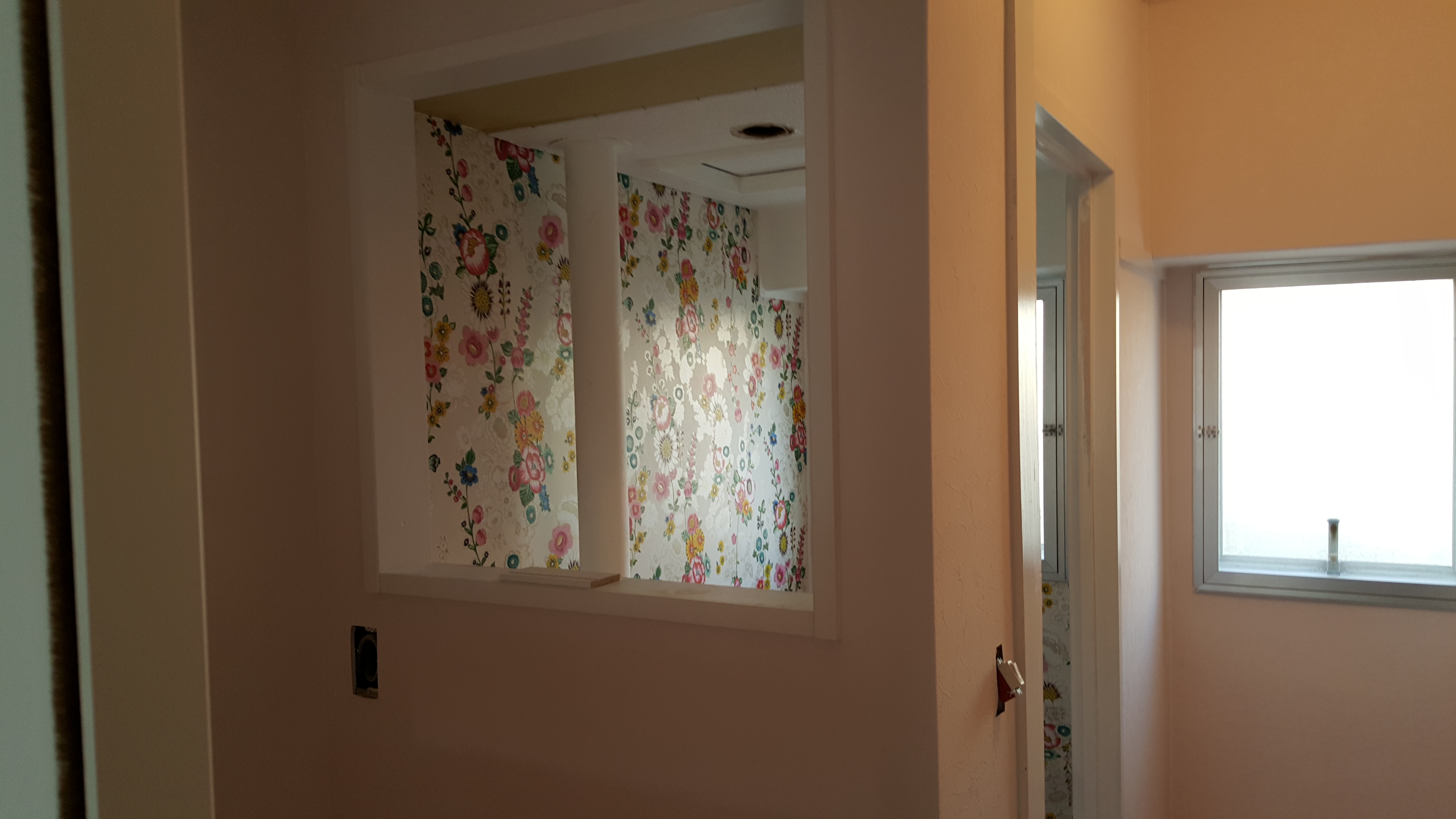 団地のリノベーション中です。 トイレに柄物のクロスを施工しました。