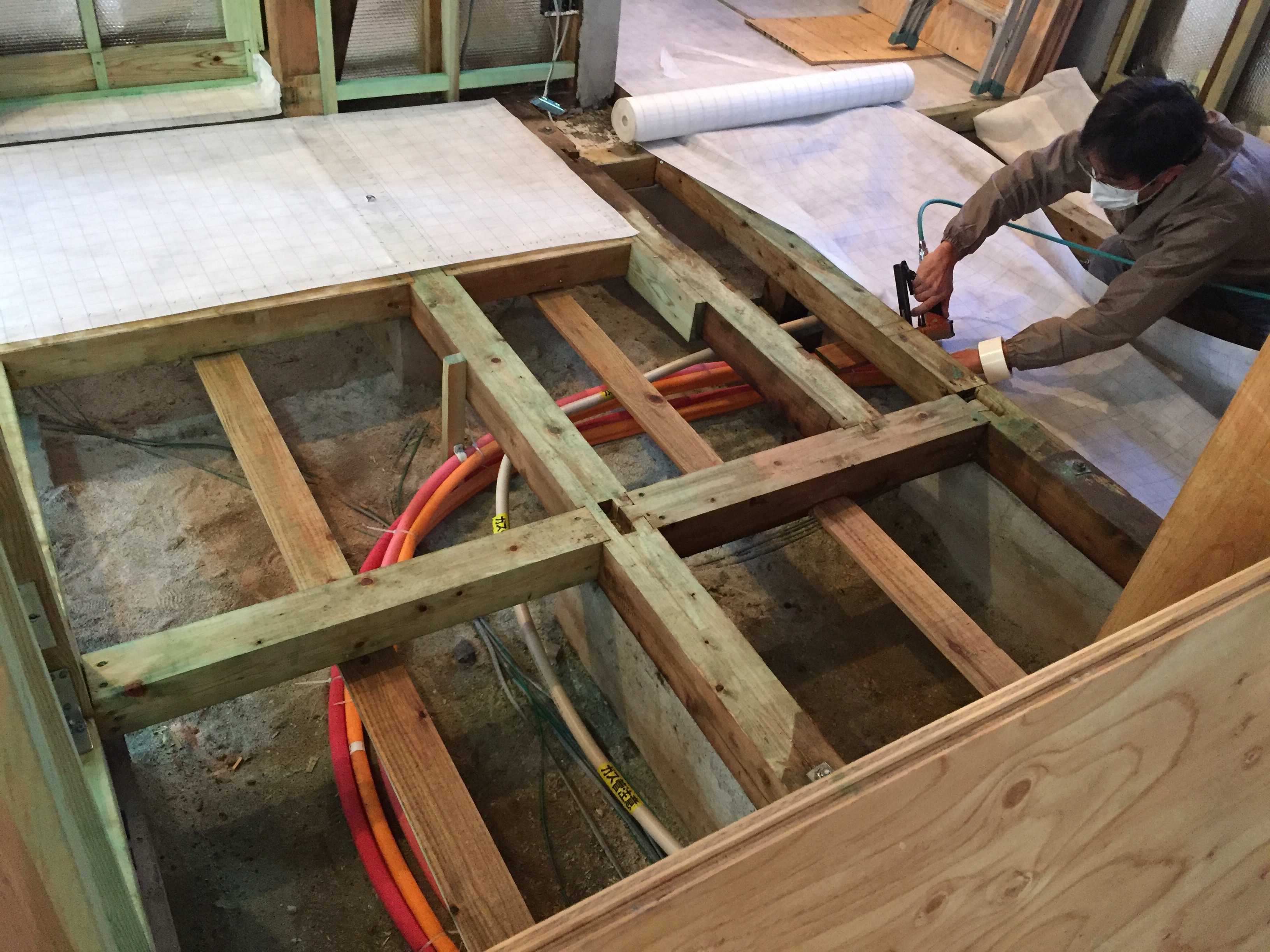 防蟻施工後シートを貼り大引き間にセルロースファイバーを充填していきます。