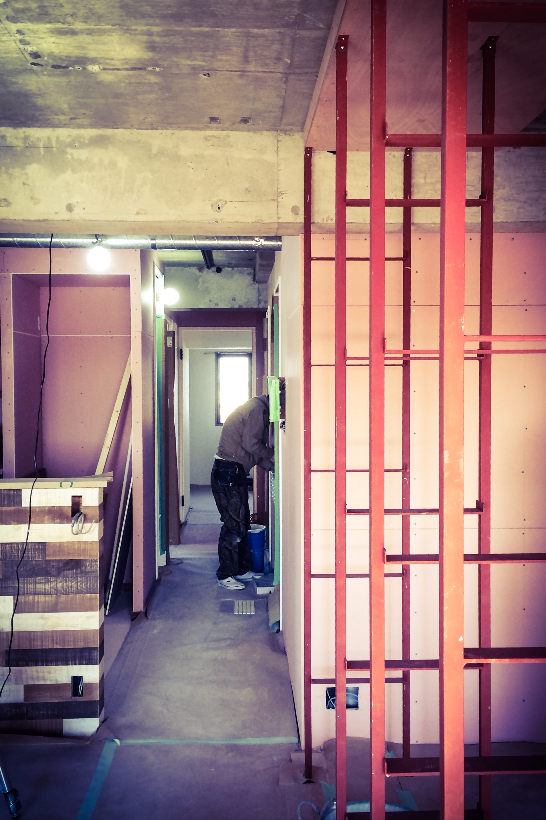 右側にスチール造作の本棚・左側にナラ無垢材の腰板張り・天井はコンクリートままで壁は珪藻土で仕上がります。