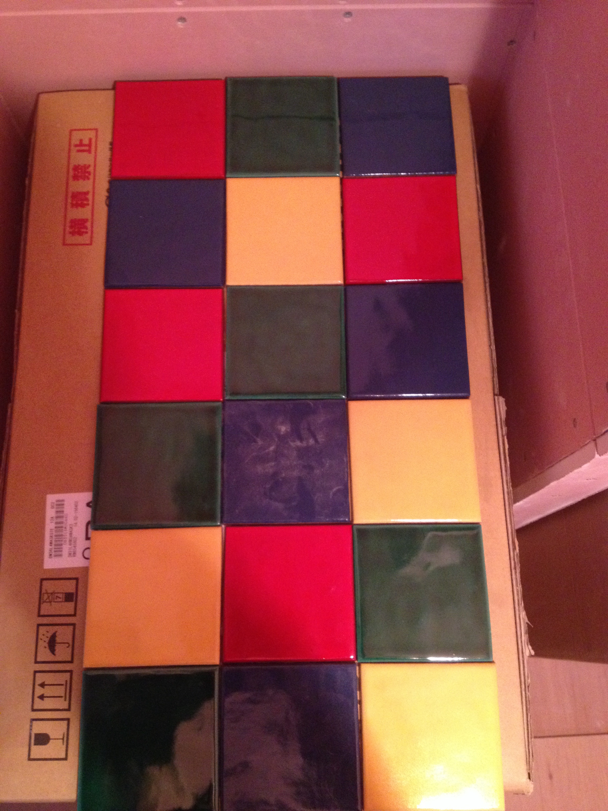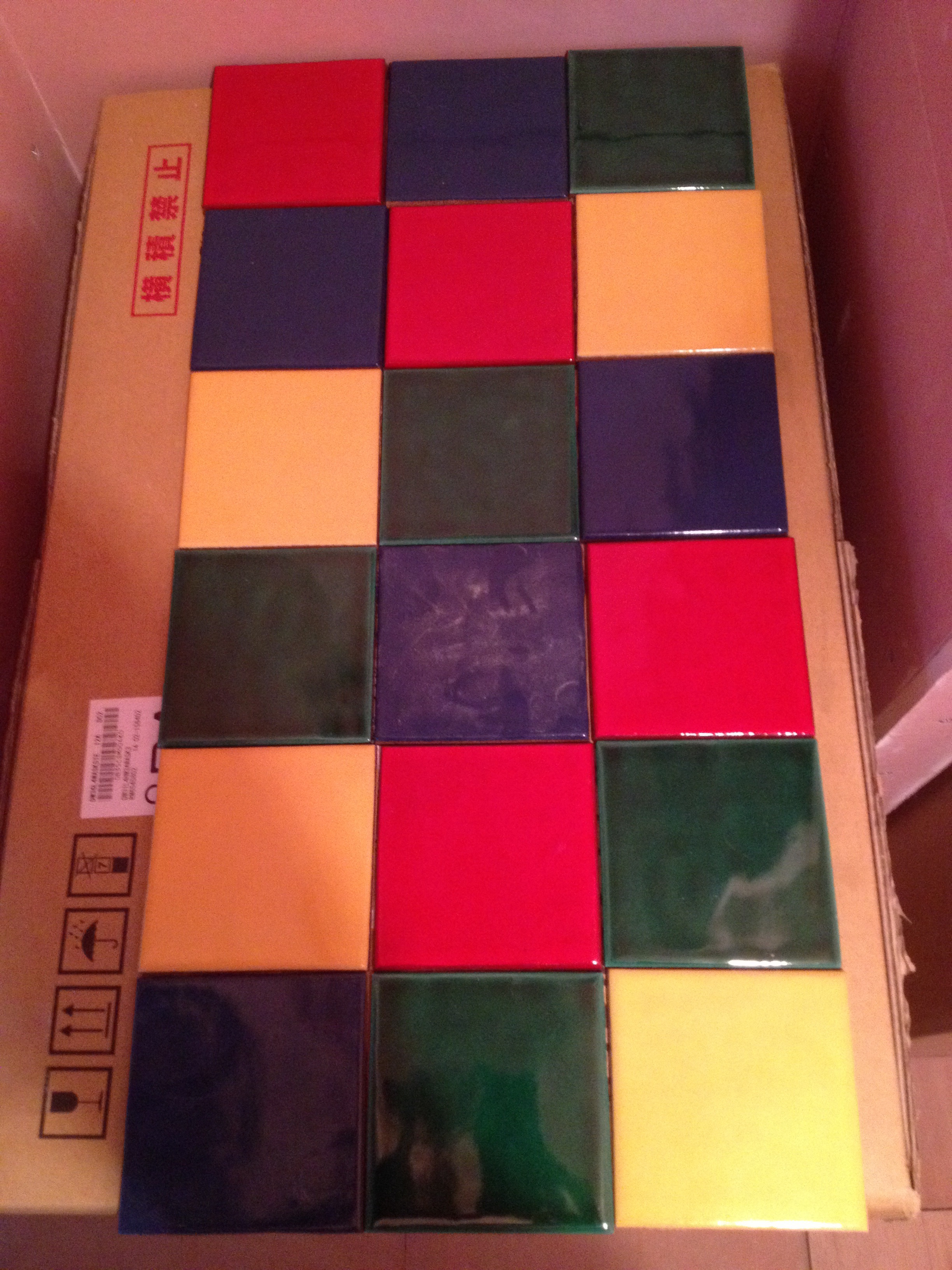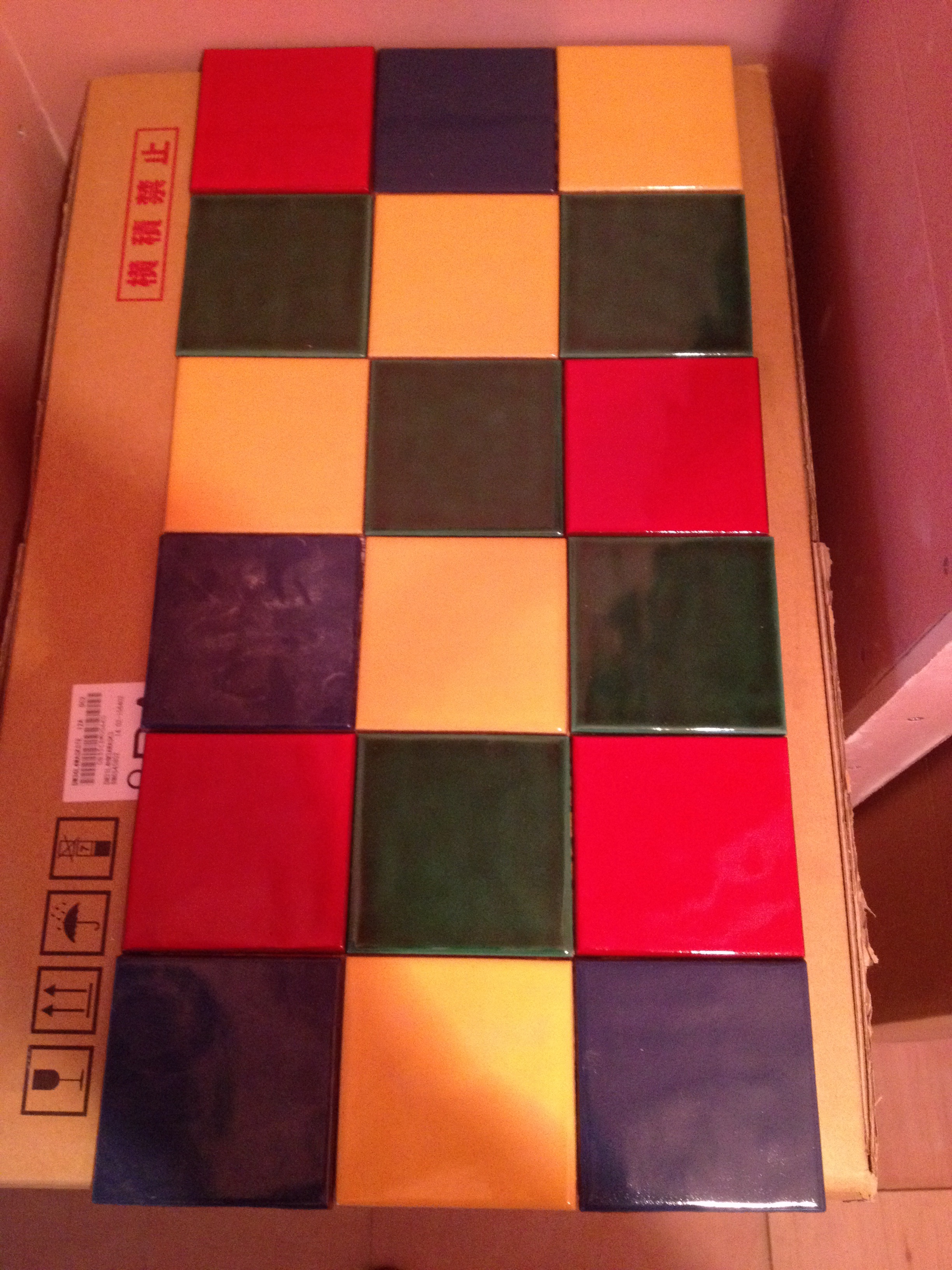 壁に貼るタイルの「かりならべ」をして色のバランスを確認しています。 どのパターンになるかは完成してからのお楽しみ